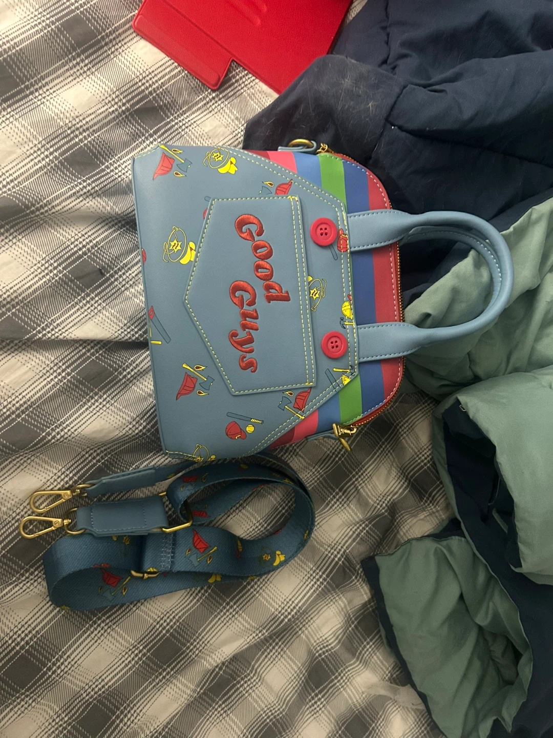 Selling a cute Loungefly Chucky themed purse and wallet! The purse features a 'Good Guys' design and comes with a detachable strap. The wallet has a Chucky and Tiffany design, perfect for any horror fan