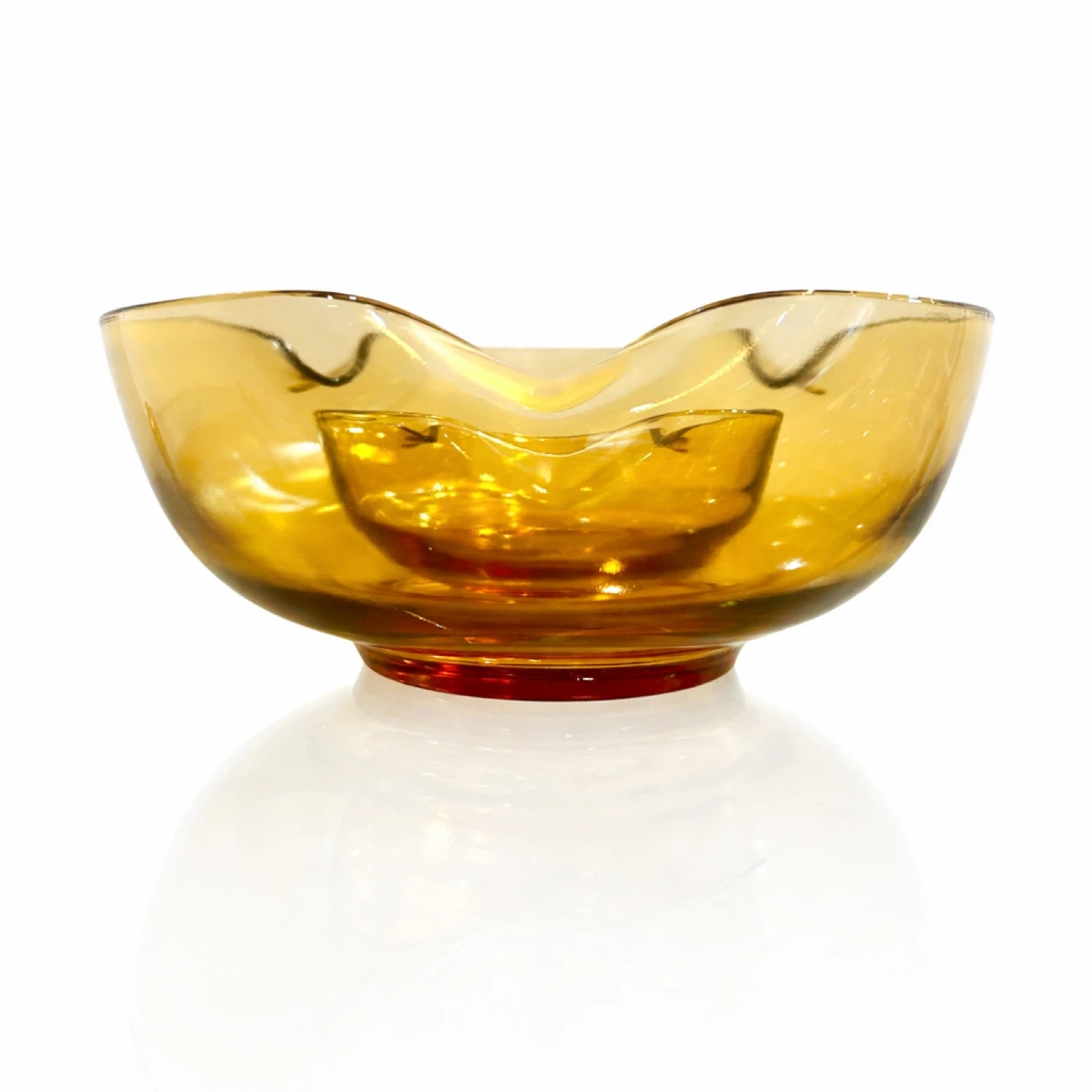 A luminous pair of Mid-Century amber art-glass bowls featuring folded “handkerchief” rims that read like a stylized lotus in profile—sensual, architectural, and unmistakably collectible. Each bowl is formed in thick amber glass with a gently undulating rim created by hot-working the glass at temperature, producing the signature petal silhouette and a beautifully weighted, gallery-worthy presence.
