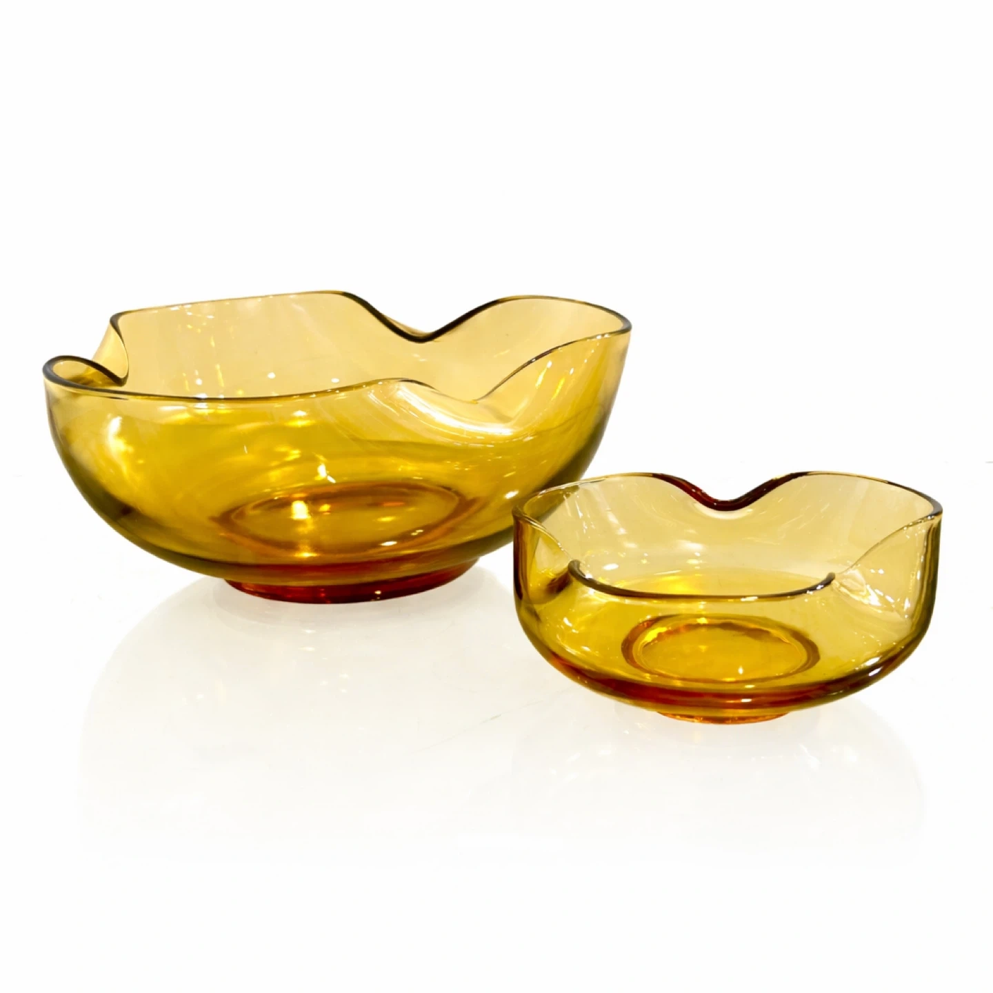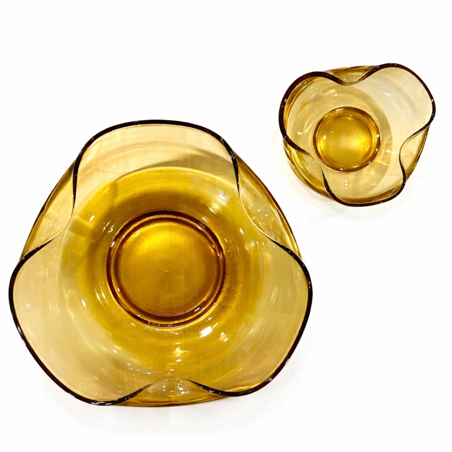 From a private collection; unmarked example consistent with European studio-glass production of the period. A sculptural, light-catching pair of amber art-glass “handkerchief” bowls with softly folded, flower-like rims and substantial weight—exactly the kind of warm-toned Mid-Century table sculpture collectors chase for shelf styling, cocktail credenzas, and curated glass cabinets. The larger bowl reads as a centerpiece; the smaller is a perfect companion for nuts, sweets, jewelry, or a tabletop vignette.