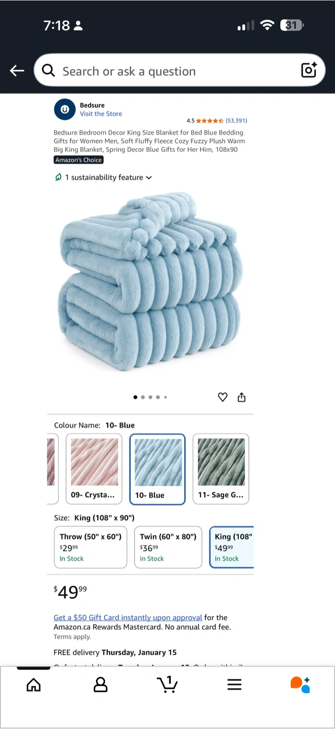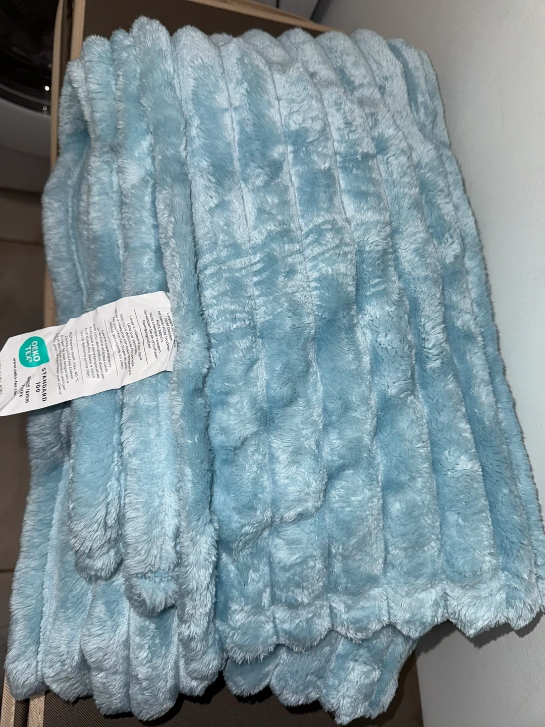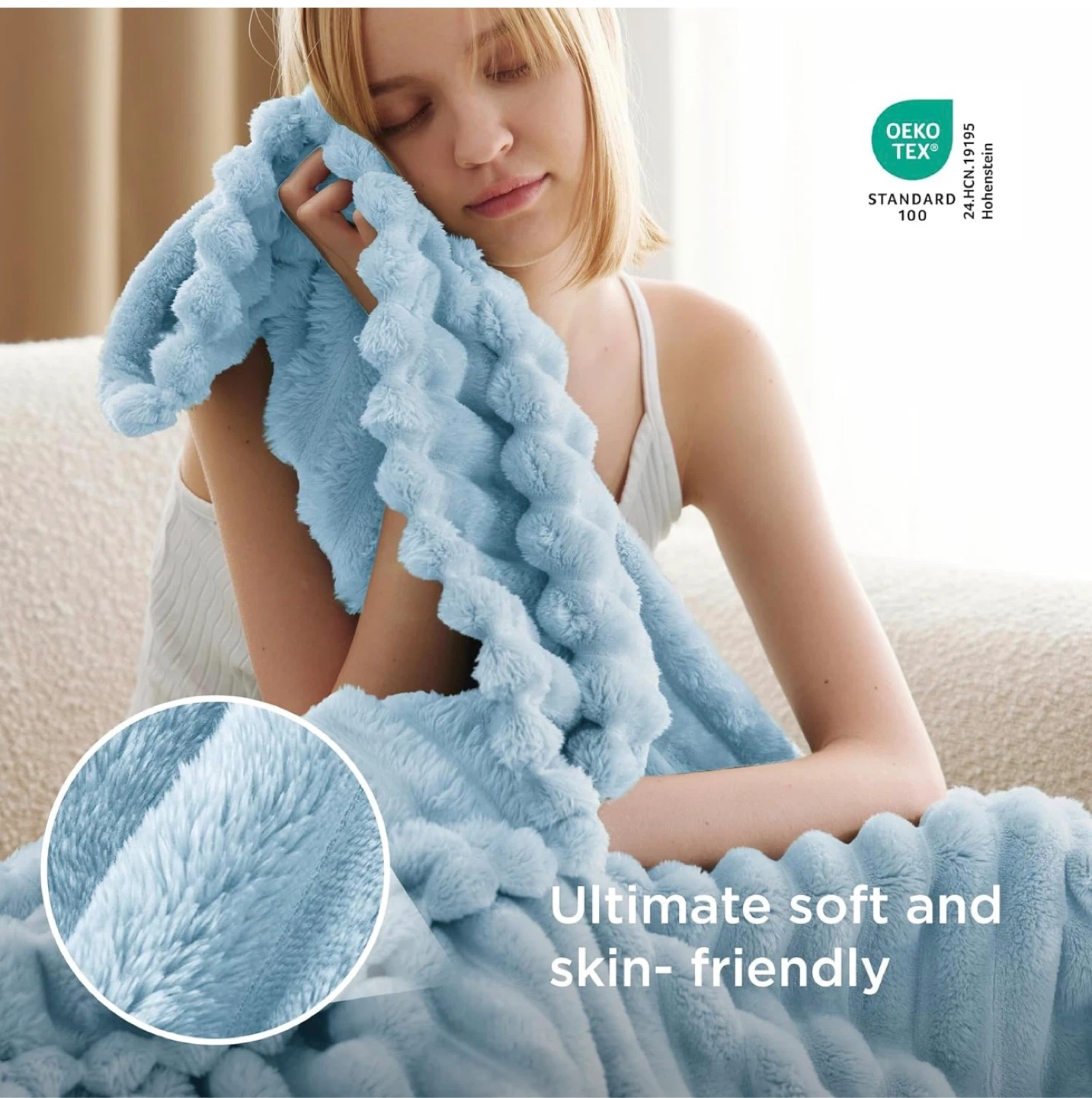 Snuggle up with this super soft Bedsure blanket! It's a king size (108" x 90") in a lovely blue colour. It's lightweight, breathable, and machine washable, making it easy to care for. Add a modern splash of colour and pattern to your bedroom or living room with this cozy blanket. New