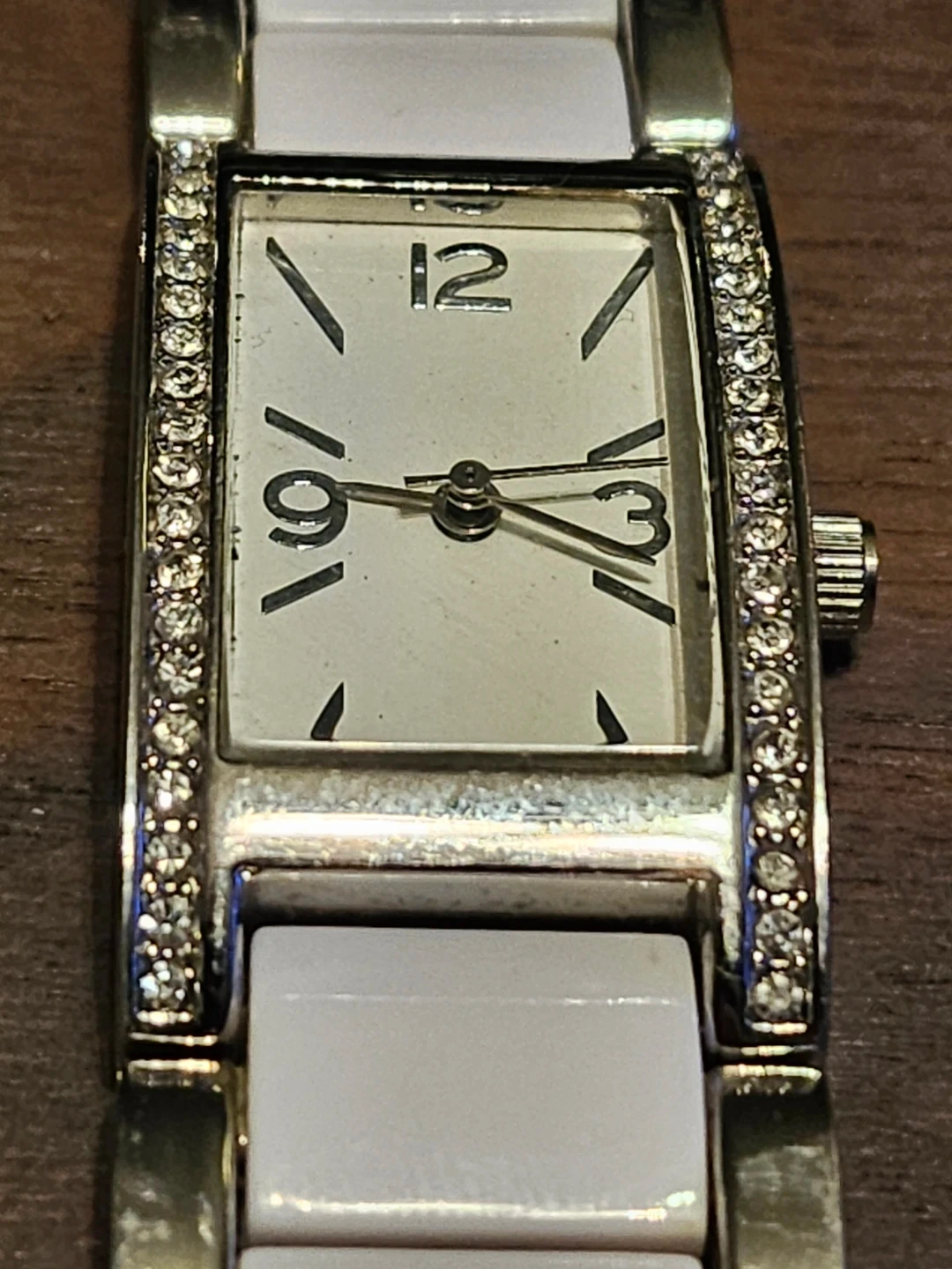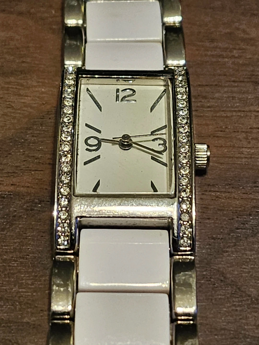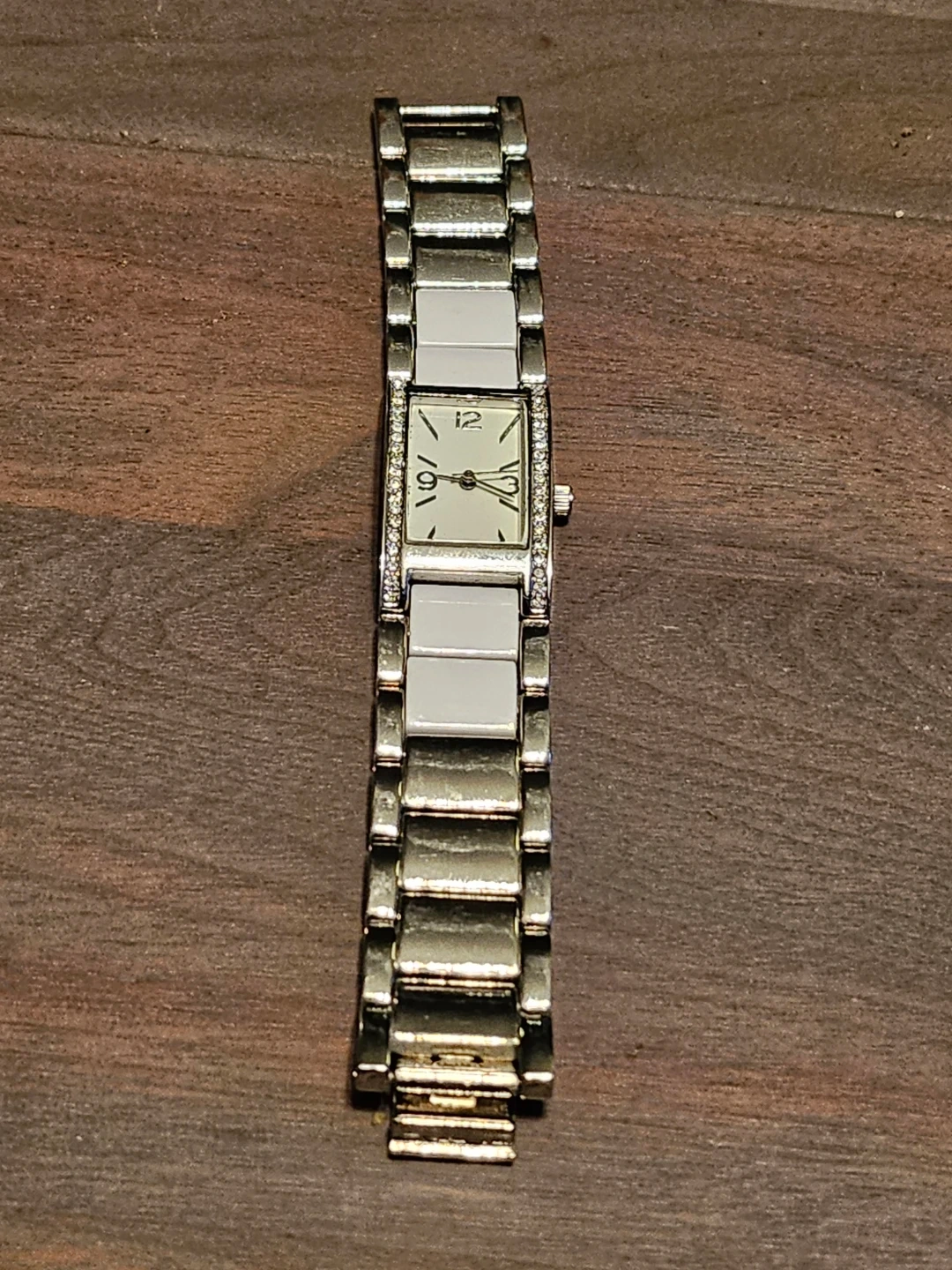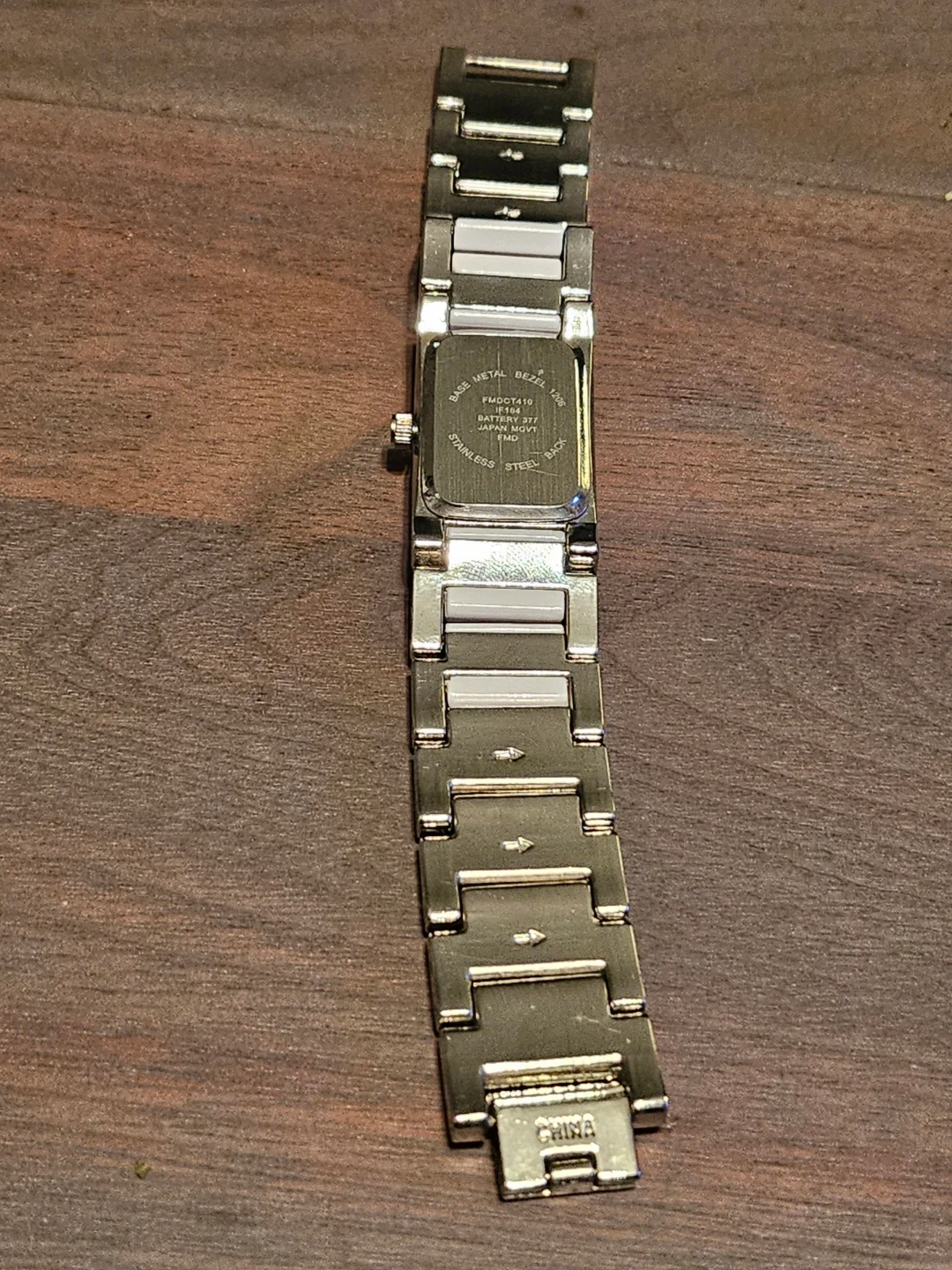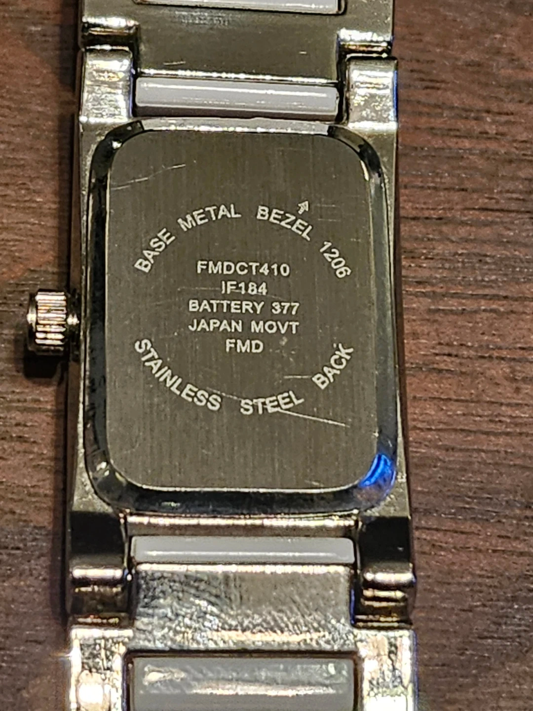 Ladies watch with a stainless steel back and base metal bezel. The watch has a battery 377 and Japan movement FMD. The model number is FMDCT410 JF184.