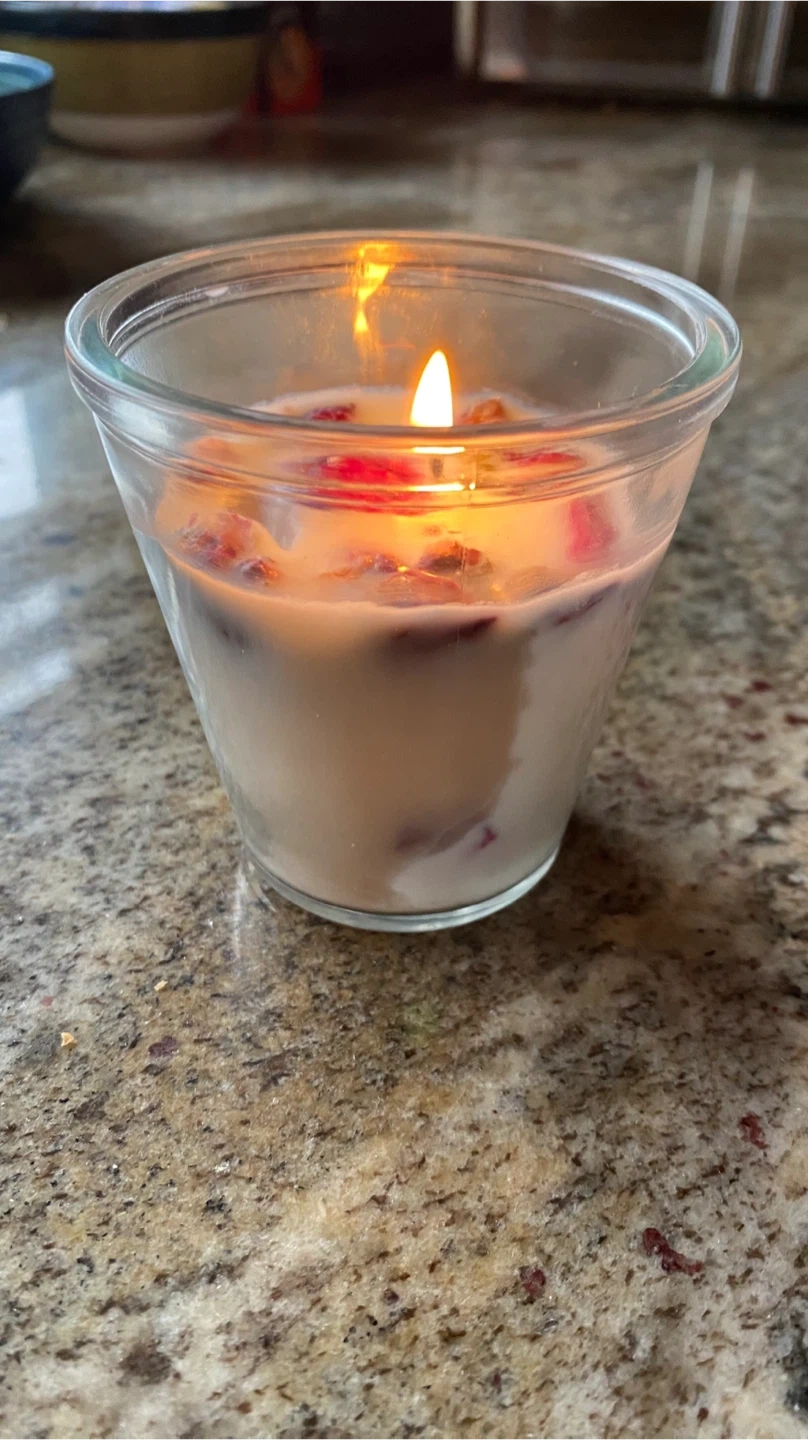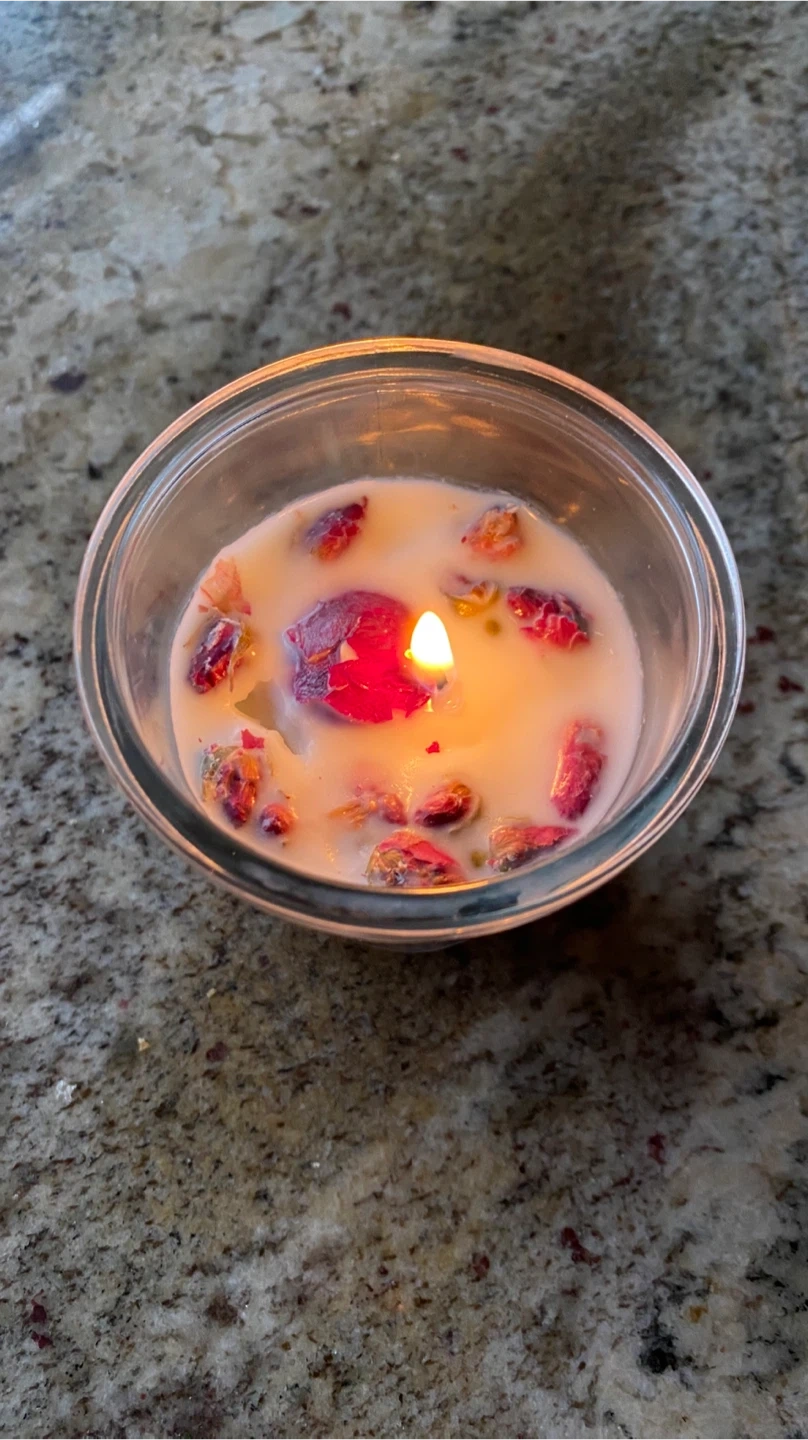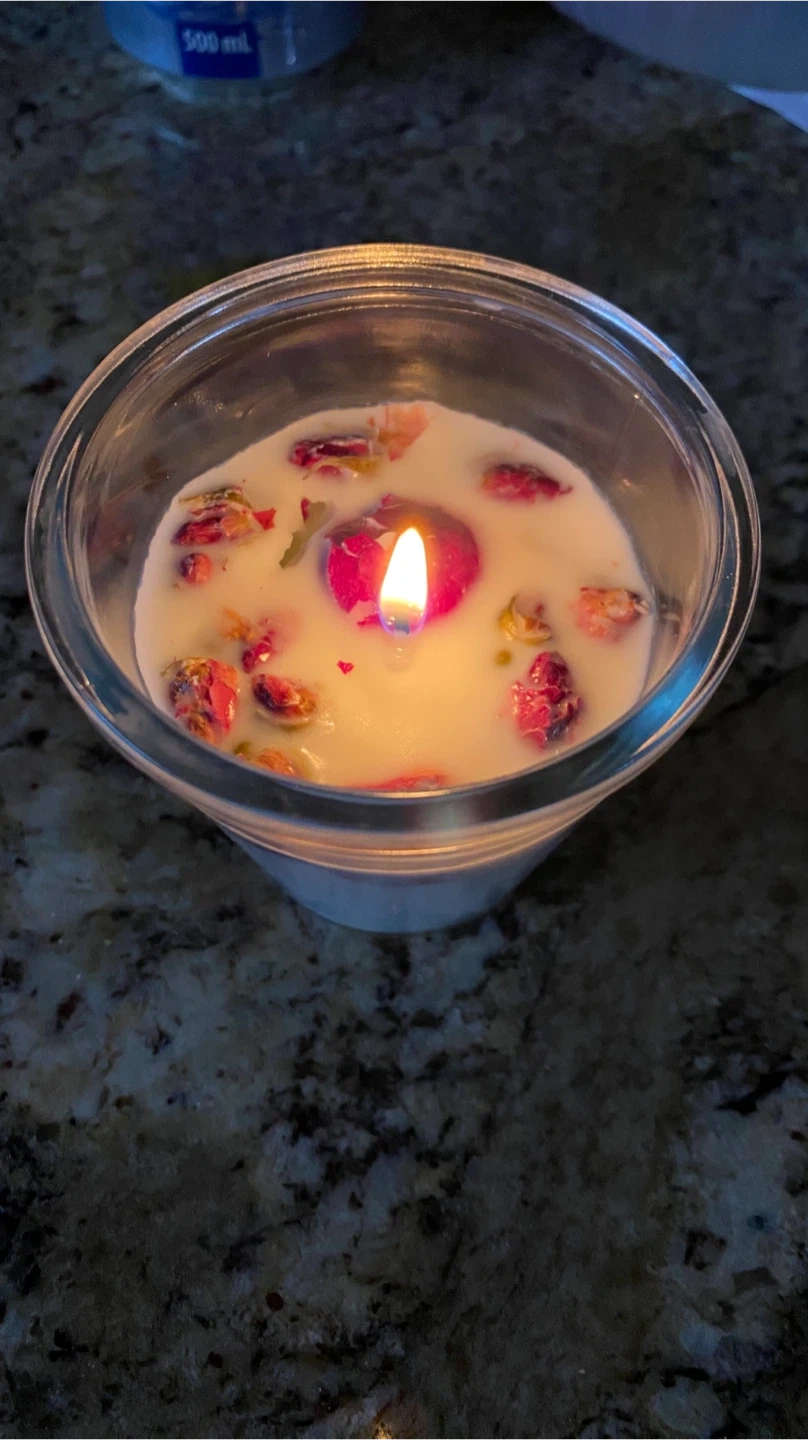 Soy lovely scented candles, perfect for creating a relaxing atmosphere in your home. It features real flower petals embedded in the natural soy wax, adding a touch of elegance and a delicate floral scent. It's in great condition and ready to bring warmth and fragrance to any room
