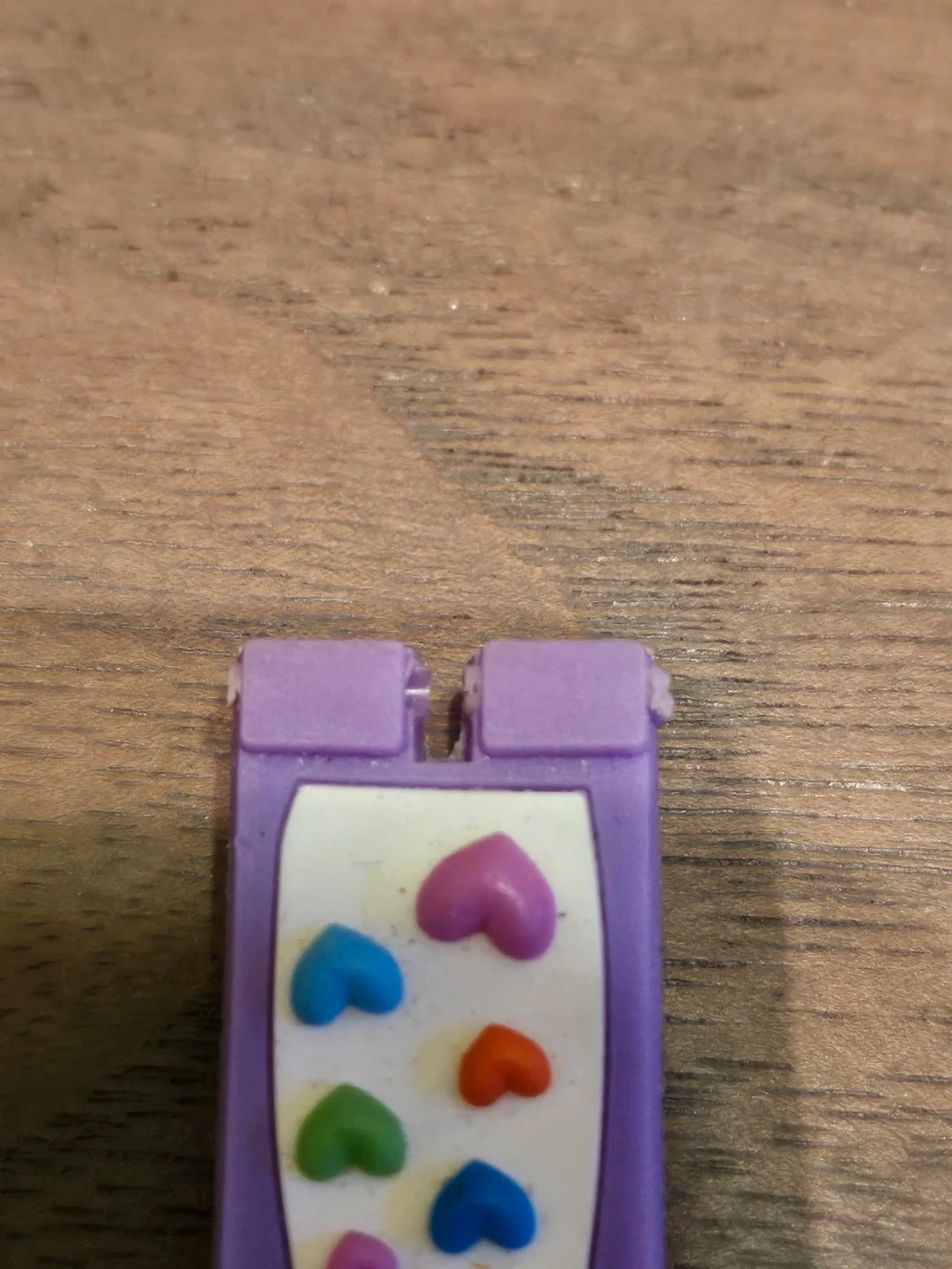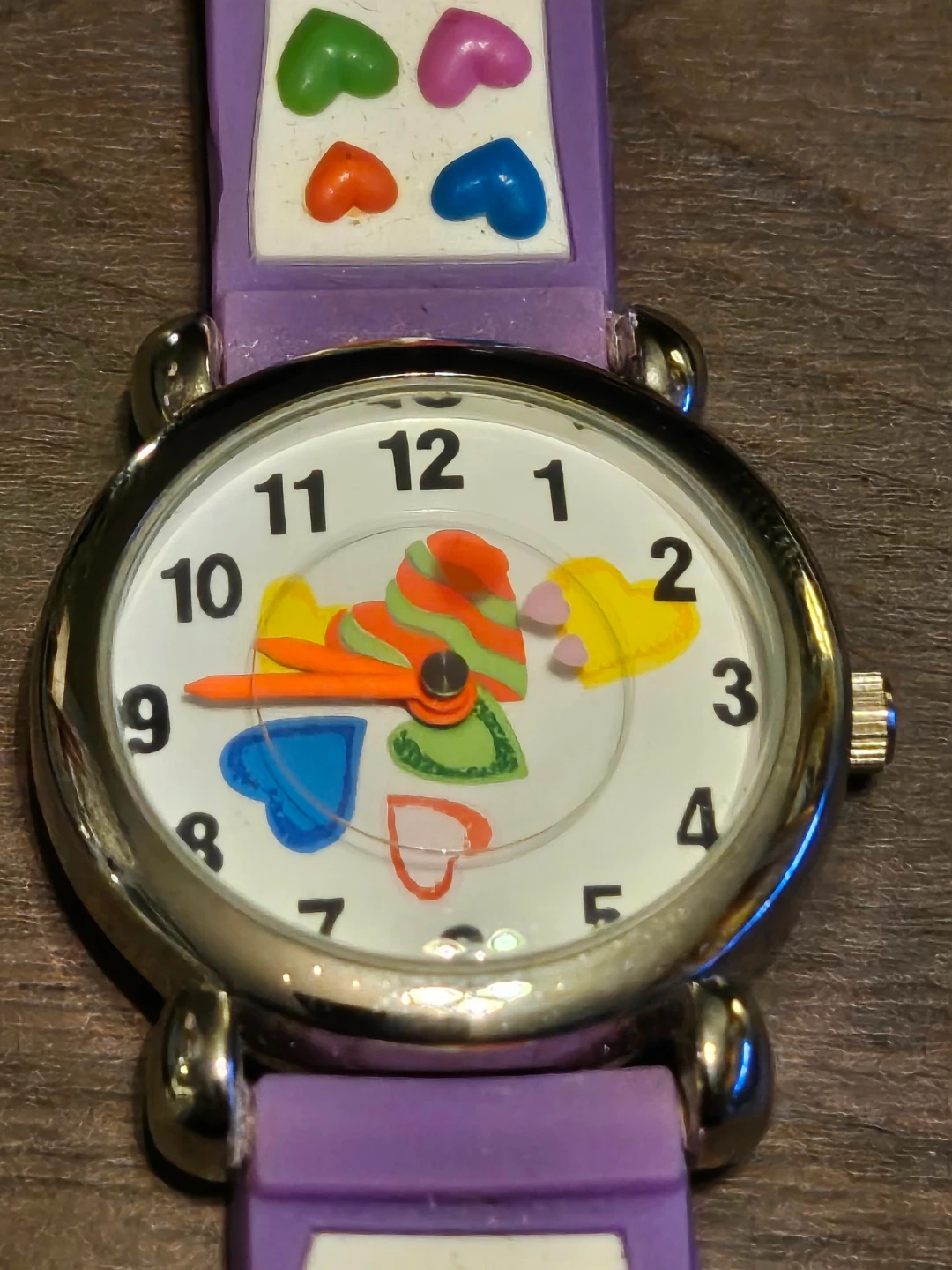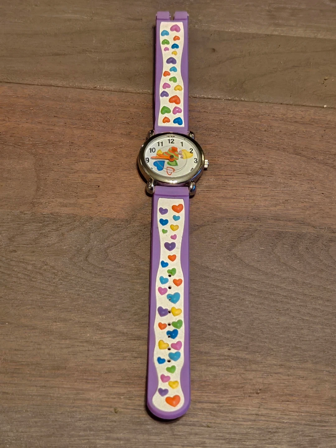 A cute purple watch perfect for kids! It features a fun design with colourful hearts on the strap and playful images on the watch face. The back of the watch is stainless steel.