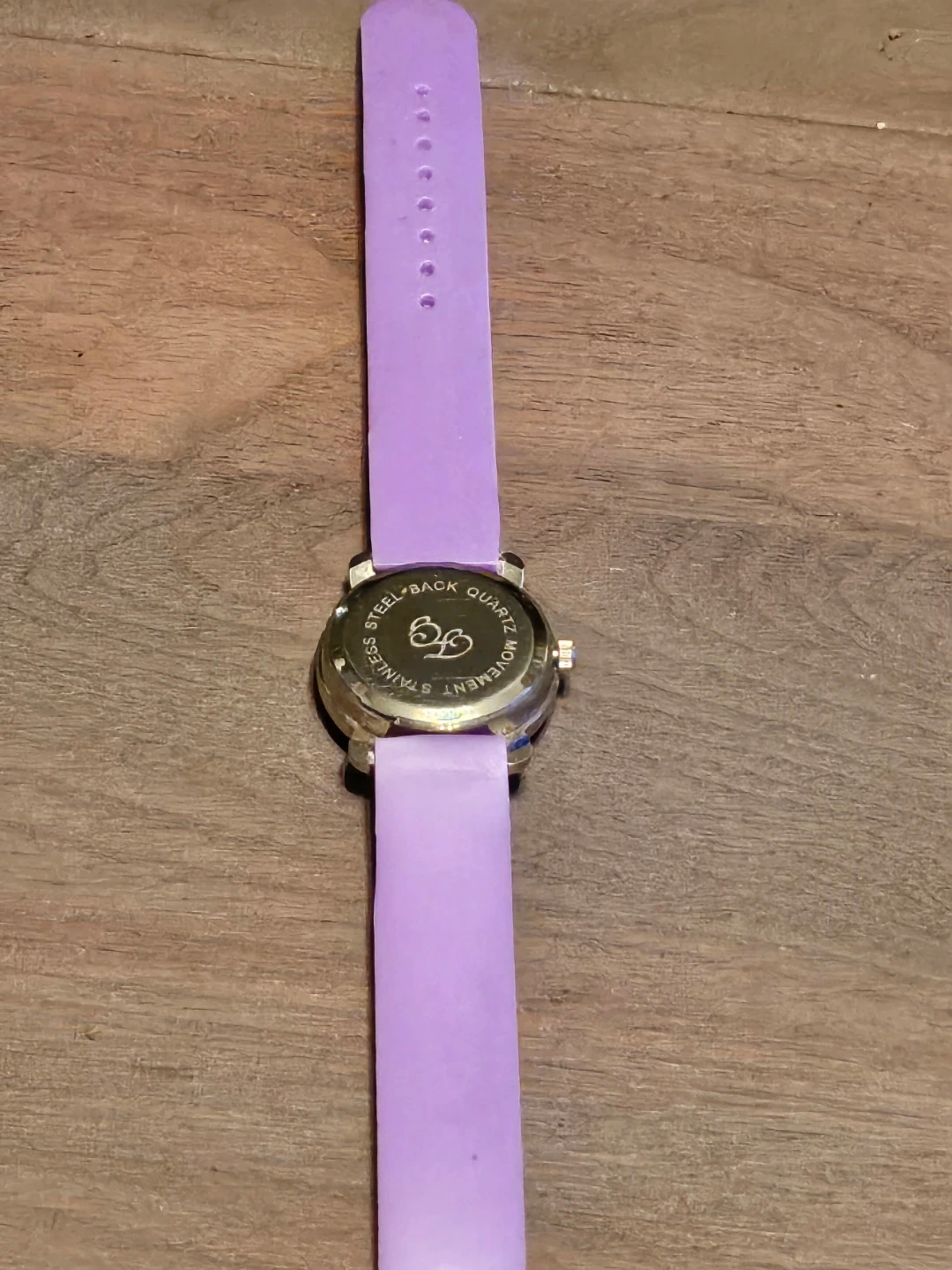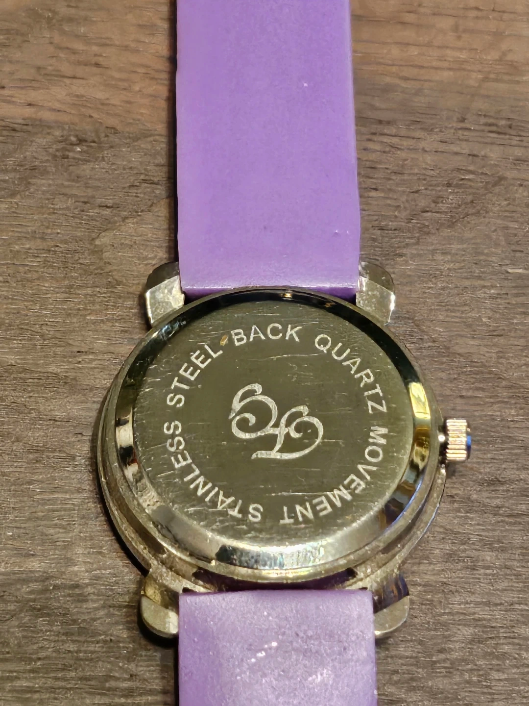 A cute purple watch perfect for kids! It features a fun design with colourful hearts on the strap and playful images on the watch face. The back of the watch is stainless steel.