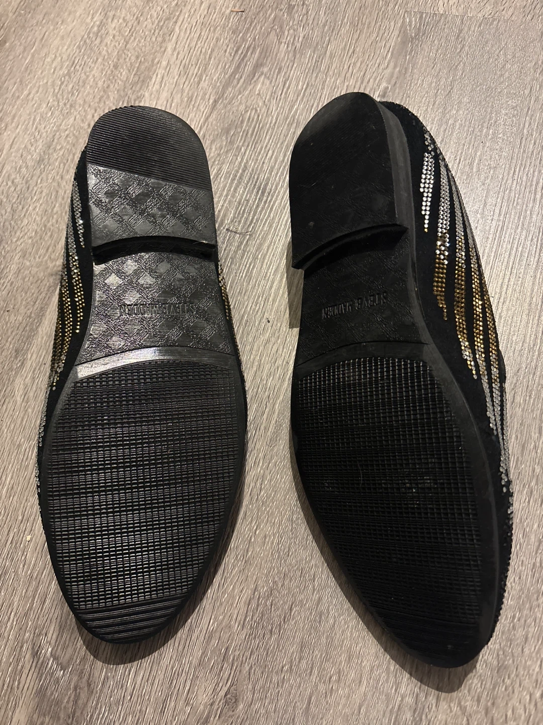 These Steve Madden loafers are sure to add some sparkle to your outfit! They feature silver and gold embellishments on a black background. Perfect for a night out or a special occasion