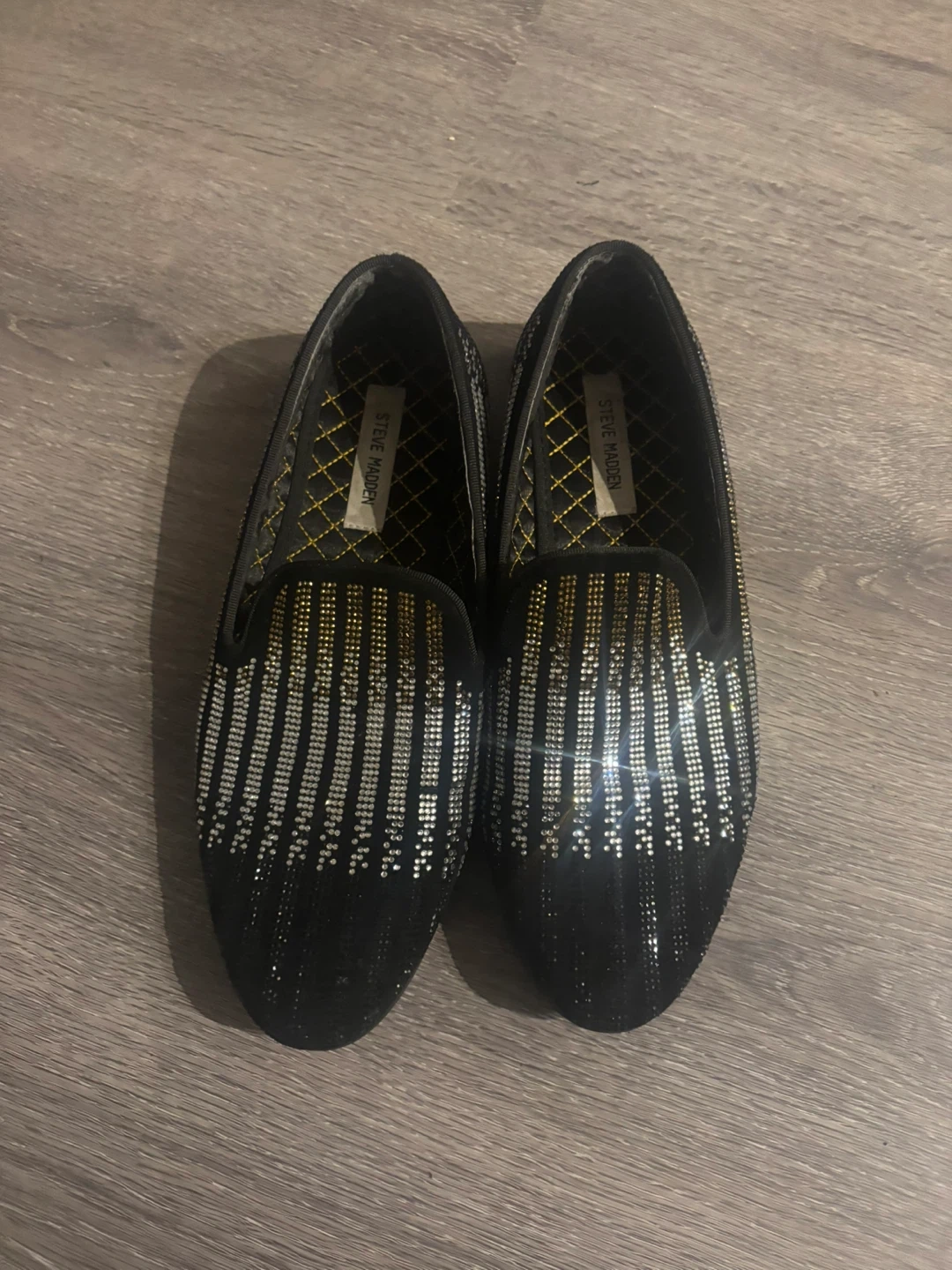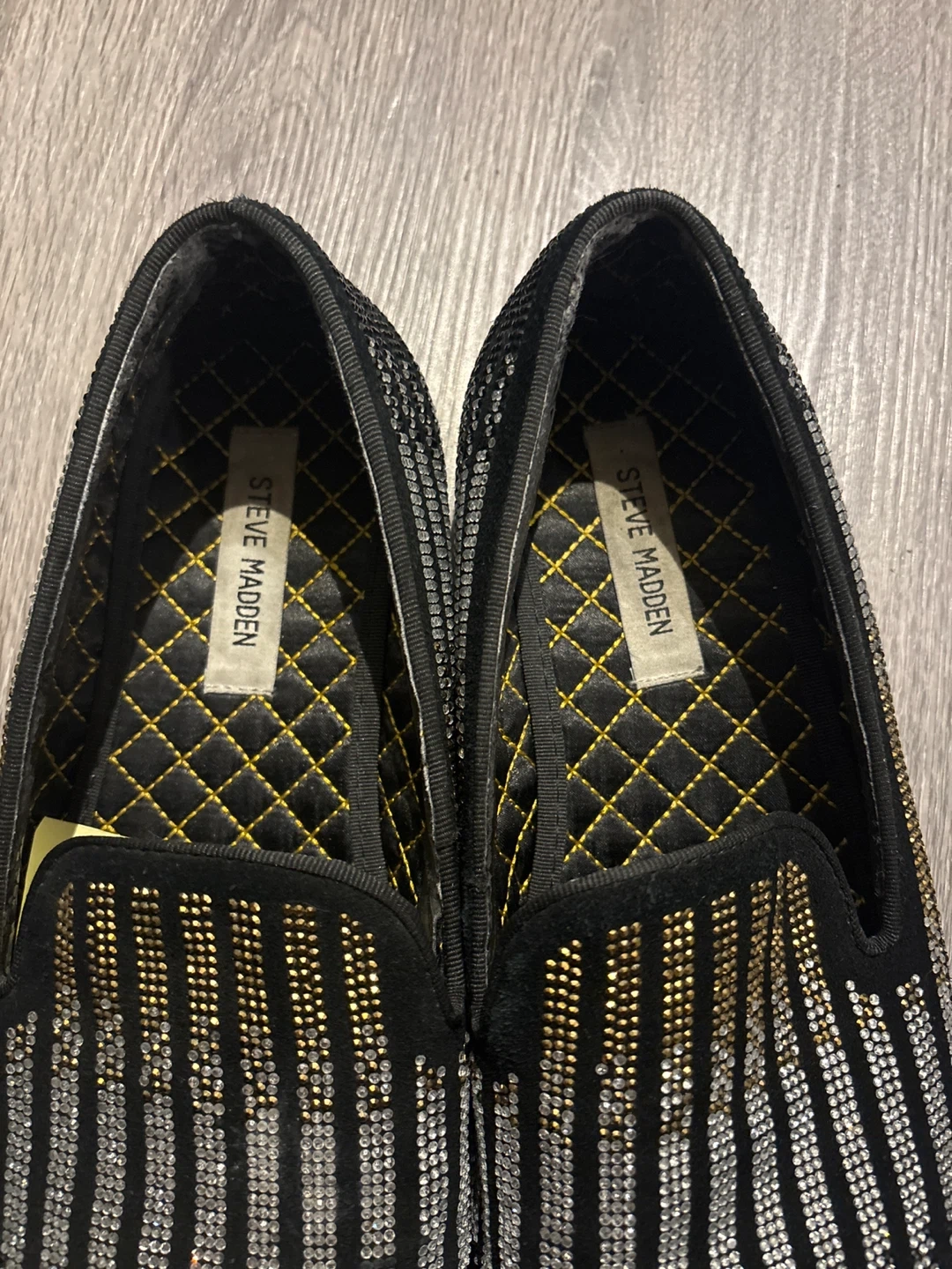 These Steve Madden loafers are sure to add some sparkle to your outfit! They feature silver and gold embellishments on a black background. Perfect for a night out or a special occasion