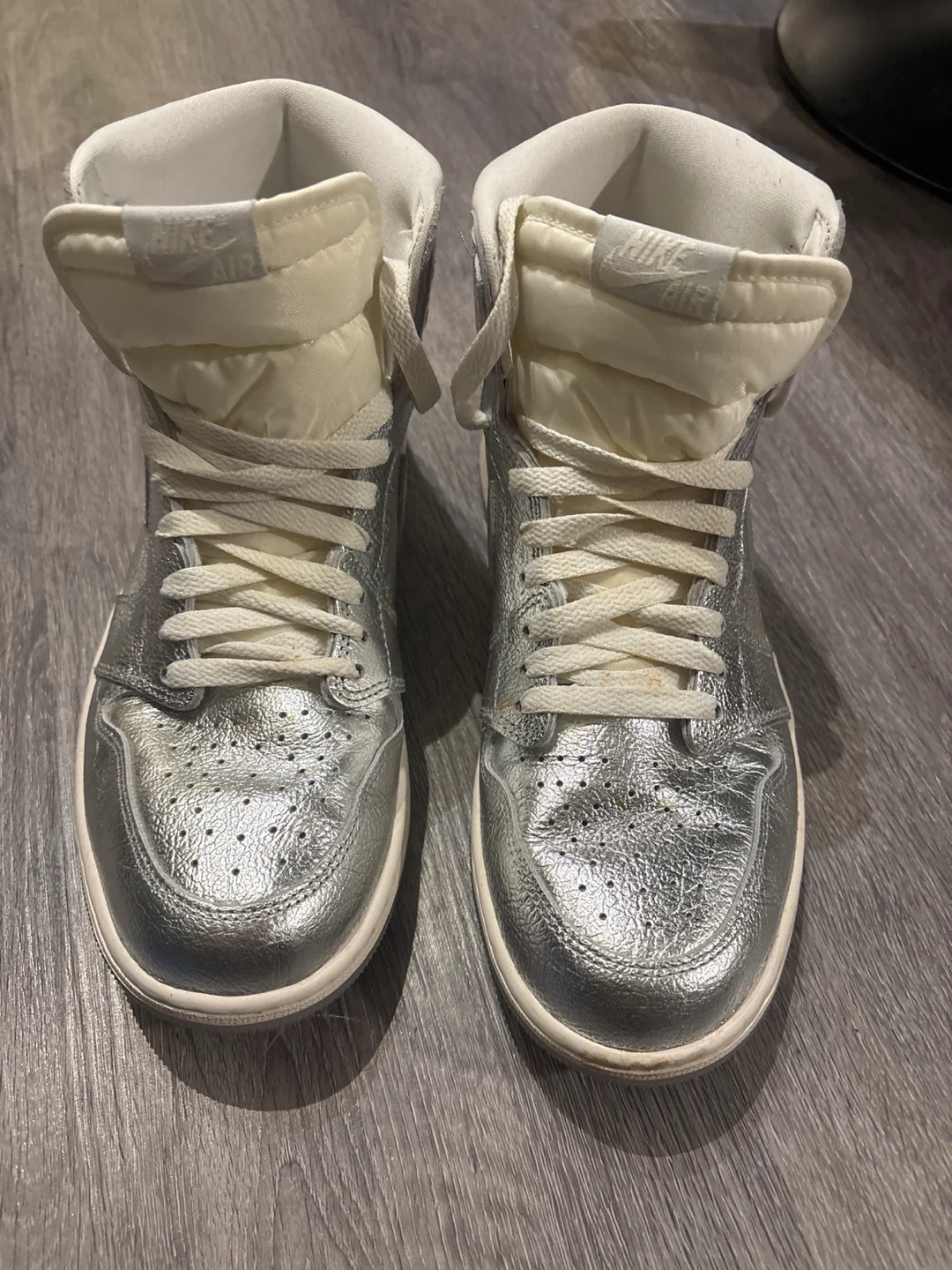 Selling a pair of Nike Air Jordan 1 High in a shiny silver colour. These shoes are in good condition and ready for a new home! Great for adding a pop to any outfit.