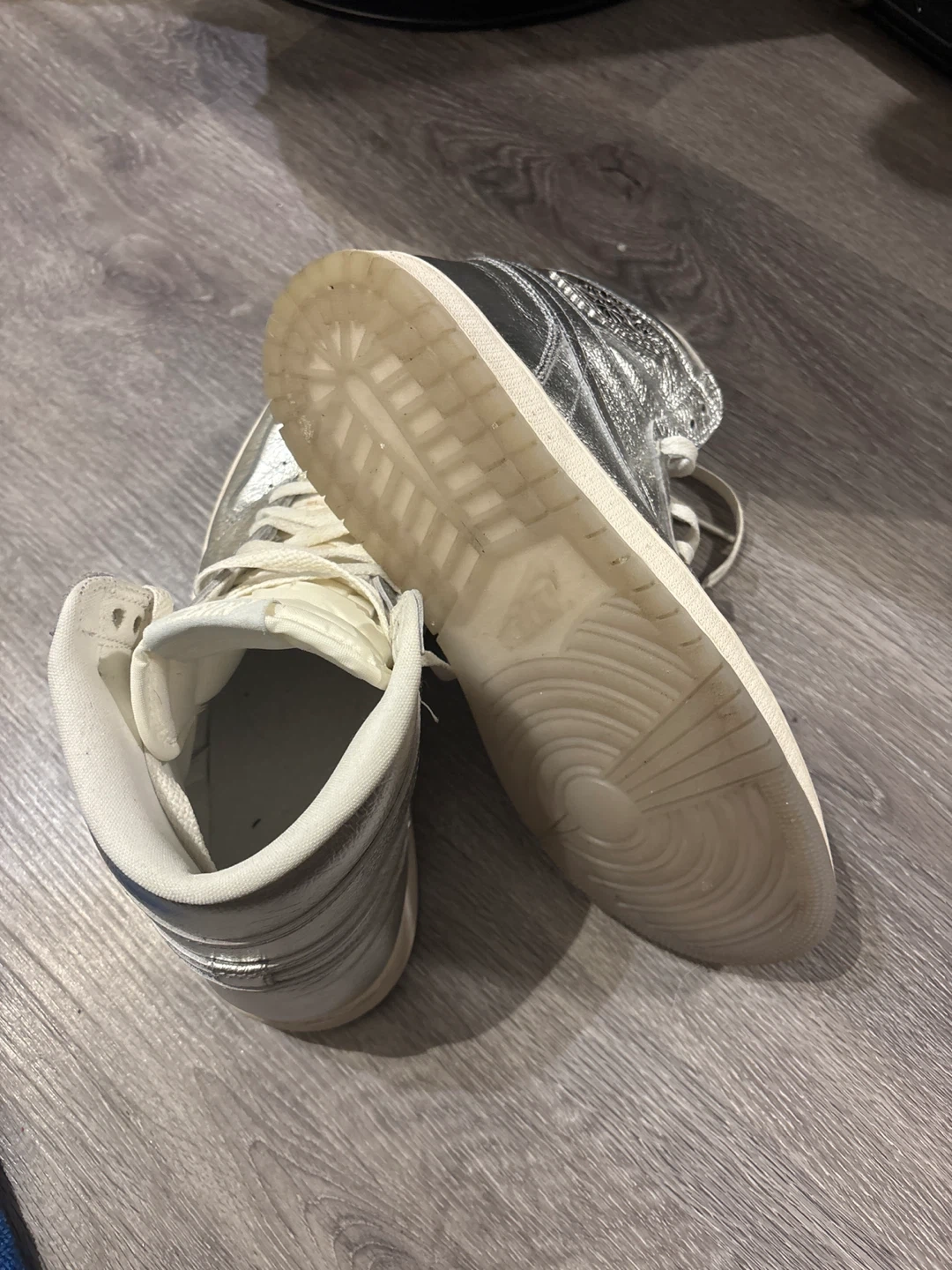 Selling a pair of Nike Air Jordan 1 High in a shiny silver colour. These shoes are in good condition and ready for a new home! Great for adding a pop to any outfit.