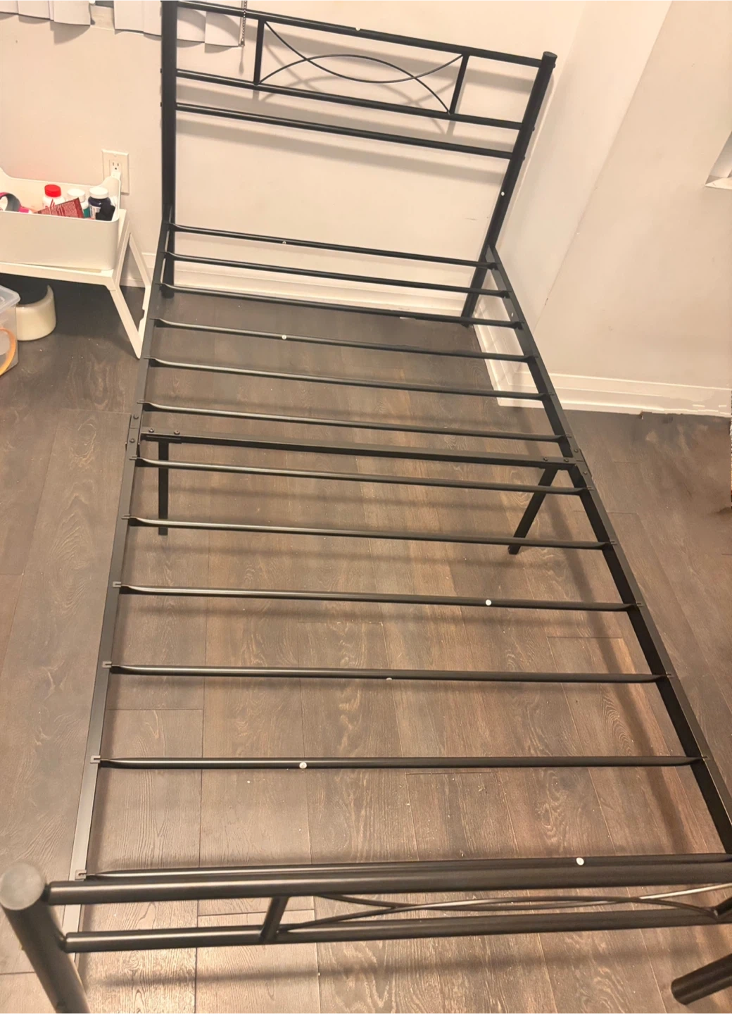 Selling a newly bought twin size bed frame with a metal frame! It's in great condition and ready for a new home. The frame is black and measures approximately 77.9" in length, 36" in width, and 34.7" in height. Perfect for a small space , student or working professional or a kid's room!