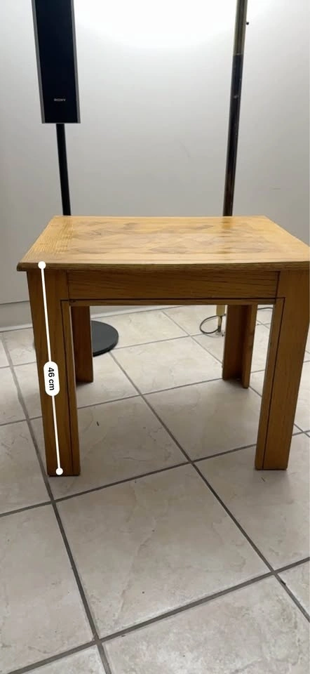 Sturdy solid oak end table featuring a beautiful basket-weave parquetry top. A timeless piece in great vintage condition—perfect as a side table, nightstand, or plant stand. Dimensions: Top: 55 cm x 43 cm, Height: 46 cm. Located in SW. Pickup only.