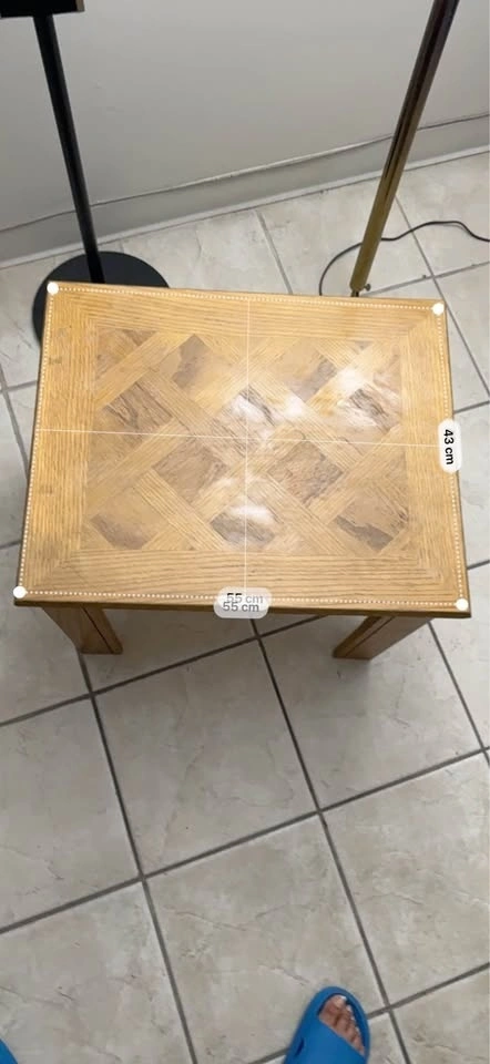 Sturdy solid oak end table featuring a beautiful basket-weave parquetry top. A timeless piece in great vintage condition—perfect as a side table, nightstand, or plant stand. Dimensions: Top: 55 cm x 43 cm, Height: 46 cm. Located in SW. Pickup only.