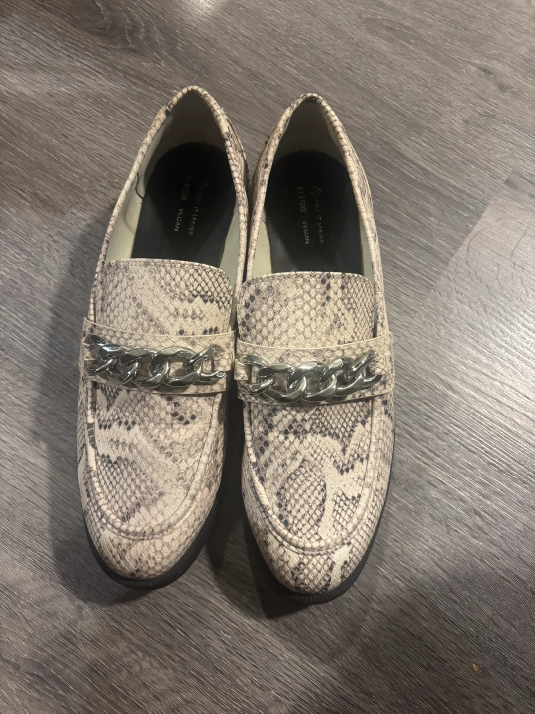 These Call It Spring loafers are a stylish and comfortable choice! The vegan material is a great alternative to leather. They feature a unique snakeskin pattern and a silver chain detail across the top. Perfect for dressing up or down!