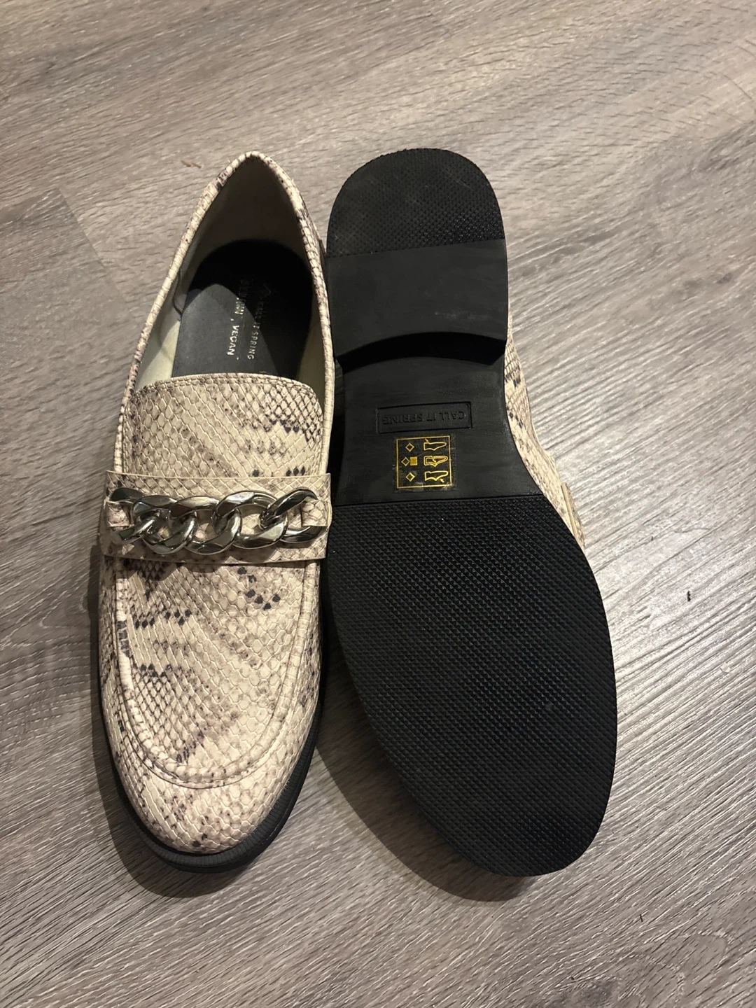 These Call It Spring loafers are a stylish and comfortable choice! The vegan material is a great alternative to leather. They feature a unique snakeskin pattern and a silver chain detail across the top. Perfect for dressing up or down!