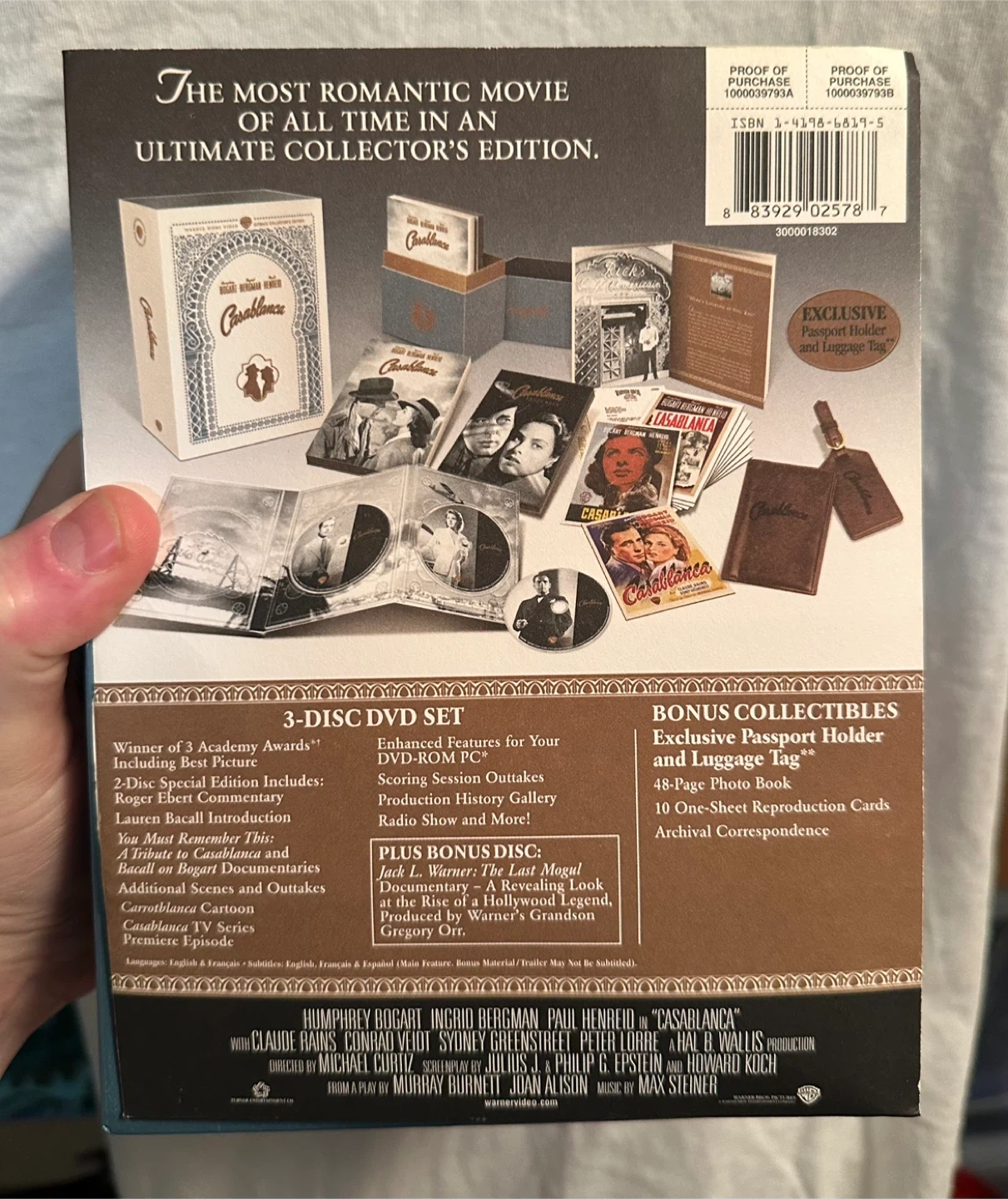 Selling the Casablanca Ultimate Collector's Edition DVD set. It's a 3-disc set that includes the movie, special features, and bonus content. Also includes bonus collectibles like a passport holder and luggage tag, a 48-page photo book, 10 one-sheet reproduction cards, and archival correspondence! A must-have for any Casablanca fan.