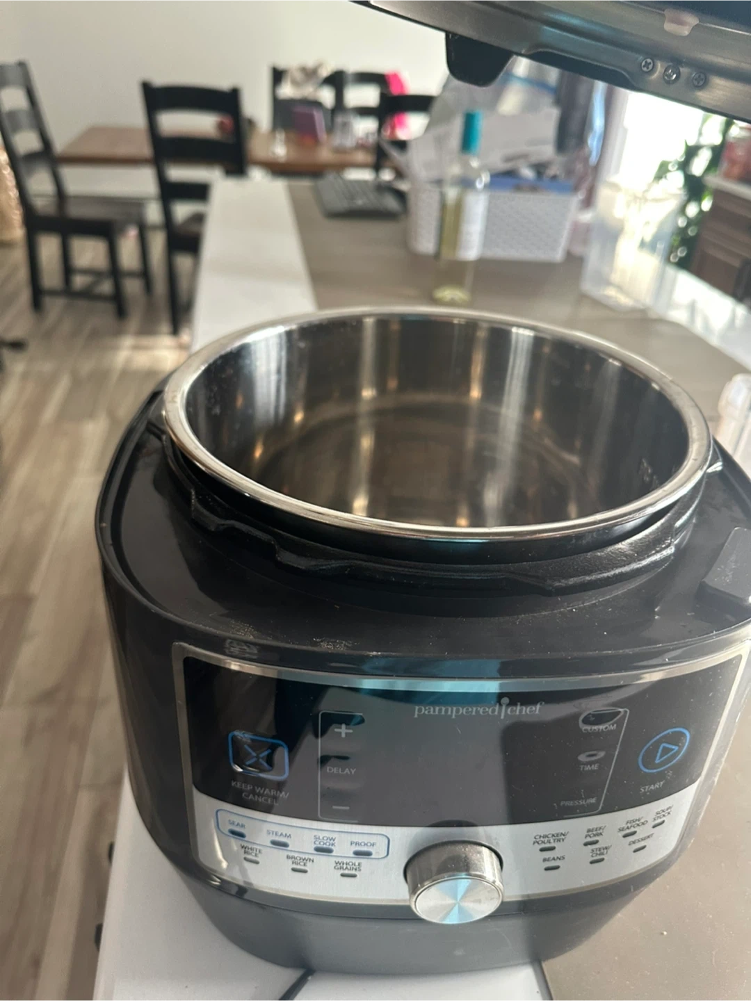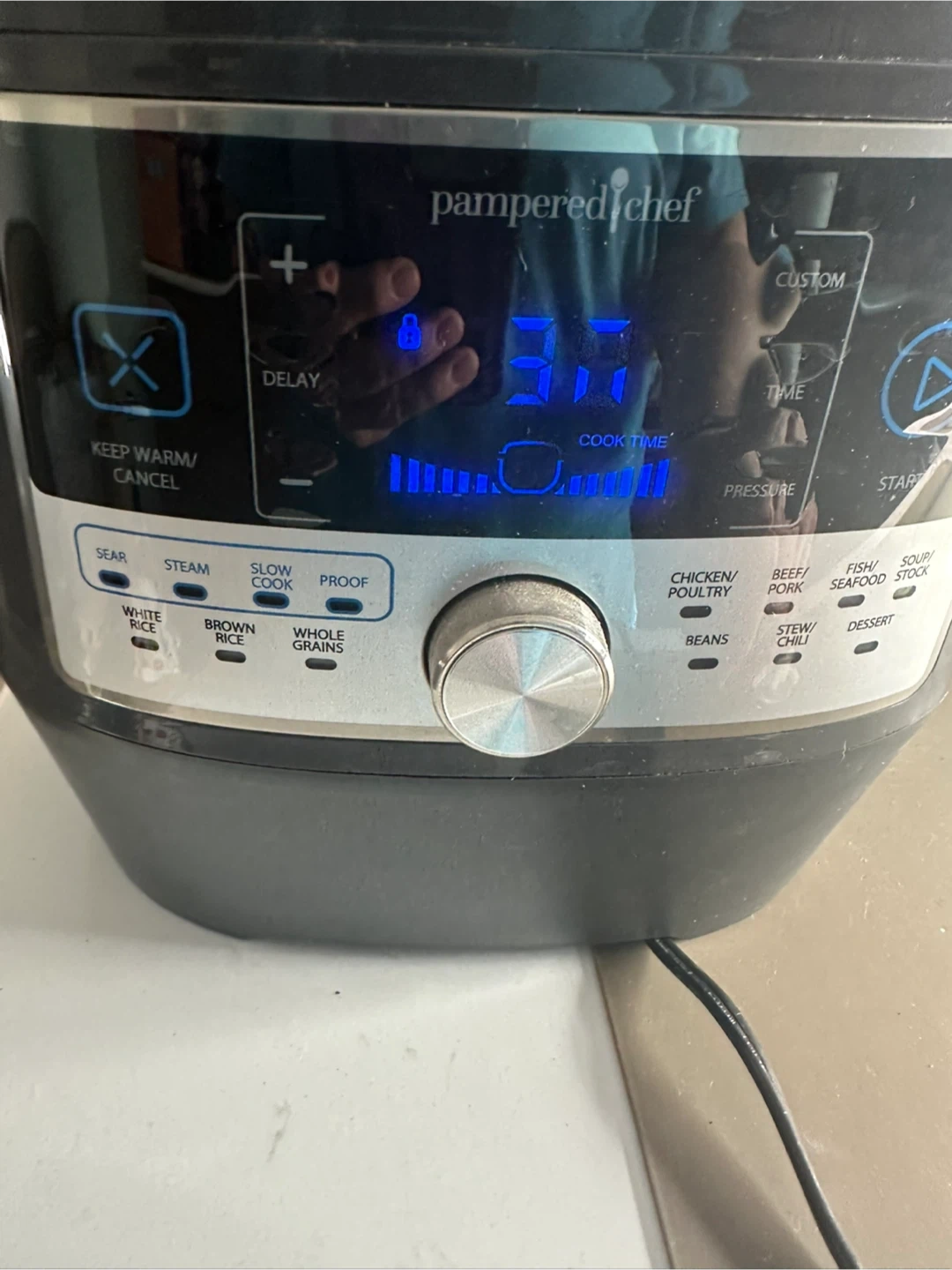 Selling a Pampered Chef electric pressure cooker. It has settings for white rice, brown rice, whole grains, beans, chicken/poultry, beef/pork, fish/seafood, stew/chili, and dessert. Also has keep warm/cancel, delay, custom time, and start buttons
