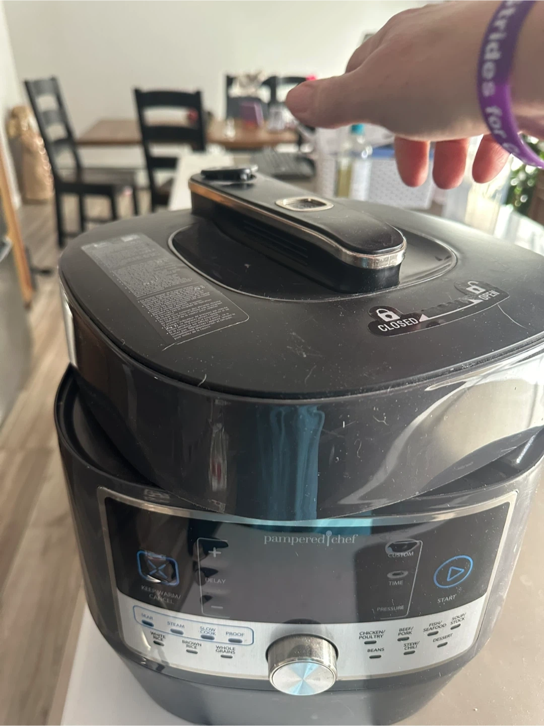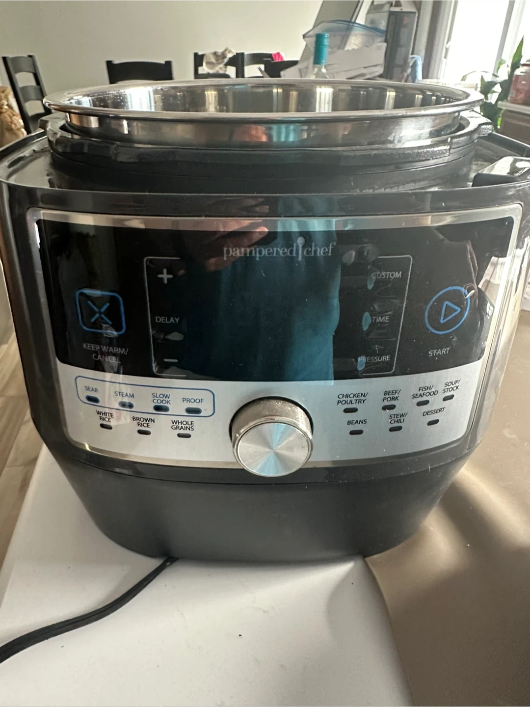 Selling a Pampered Chef electric pressure cooker. It has settings for white rice, brown rice, whole grains, beans, chicken/poultry, beef/pork, fish/seafood, stew/chili, and dessert. Also has keep warm/cancel, delay, custom time, and start buttons