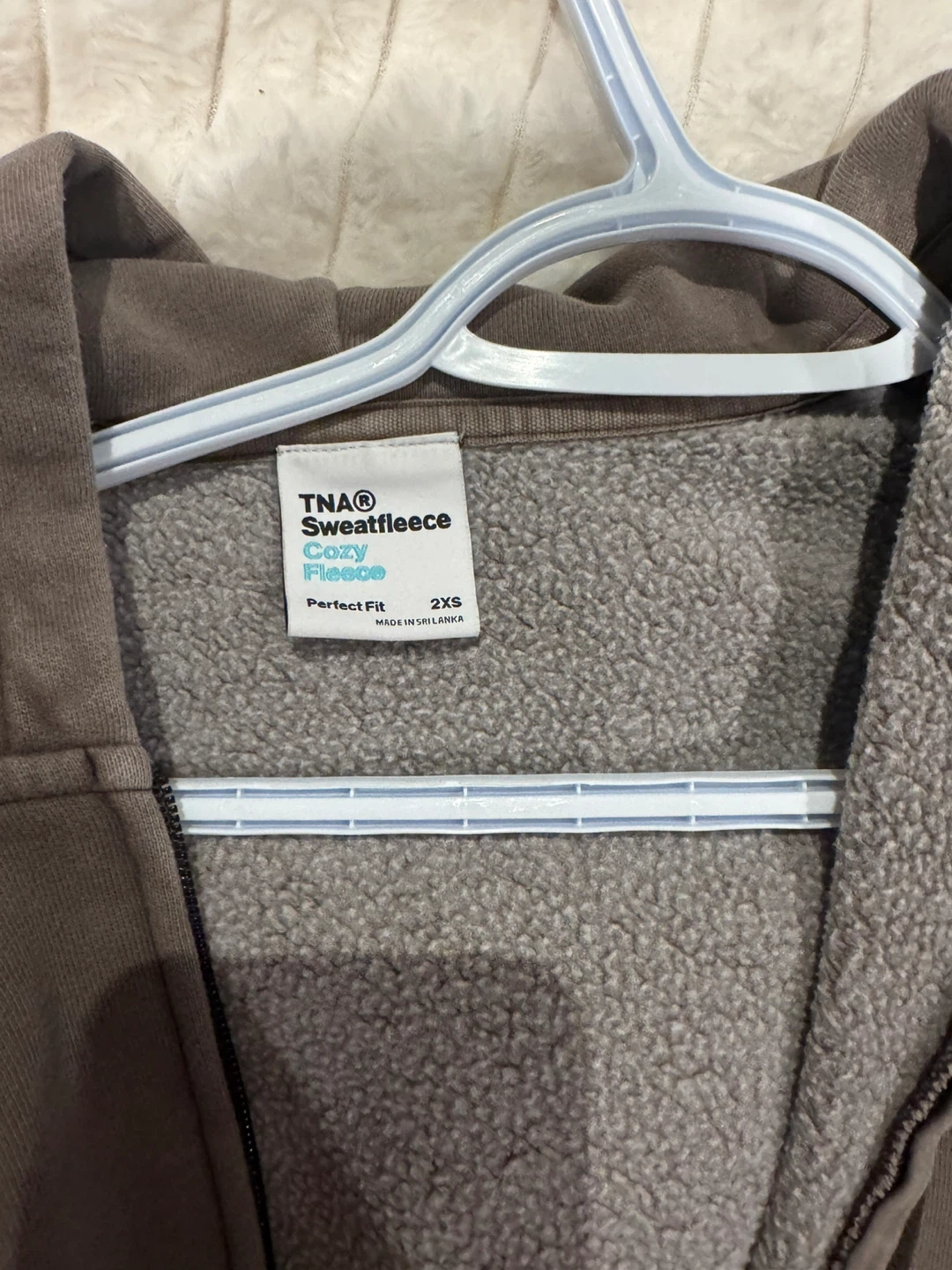 Selling a TNA Sweatfleece Cozy Fleece zip-up hoodie in size 2XS. It's a perfect fit and super comfy for those cooler days! There's a small stain on the sleeve, but otherwise it's in great condition