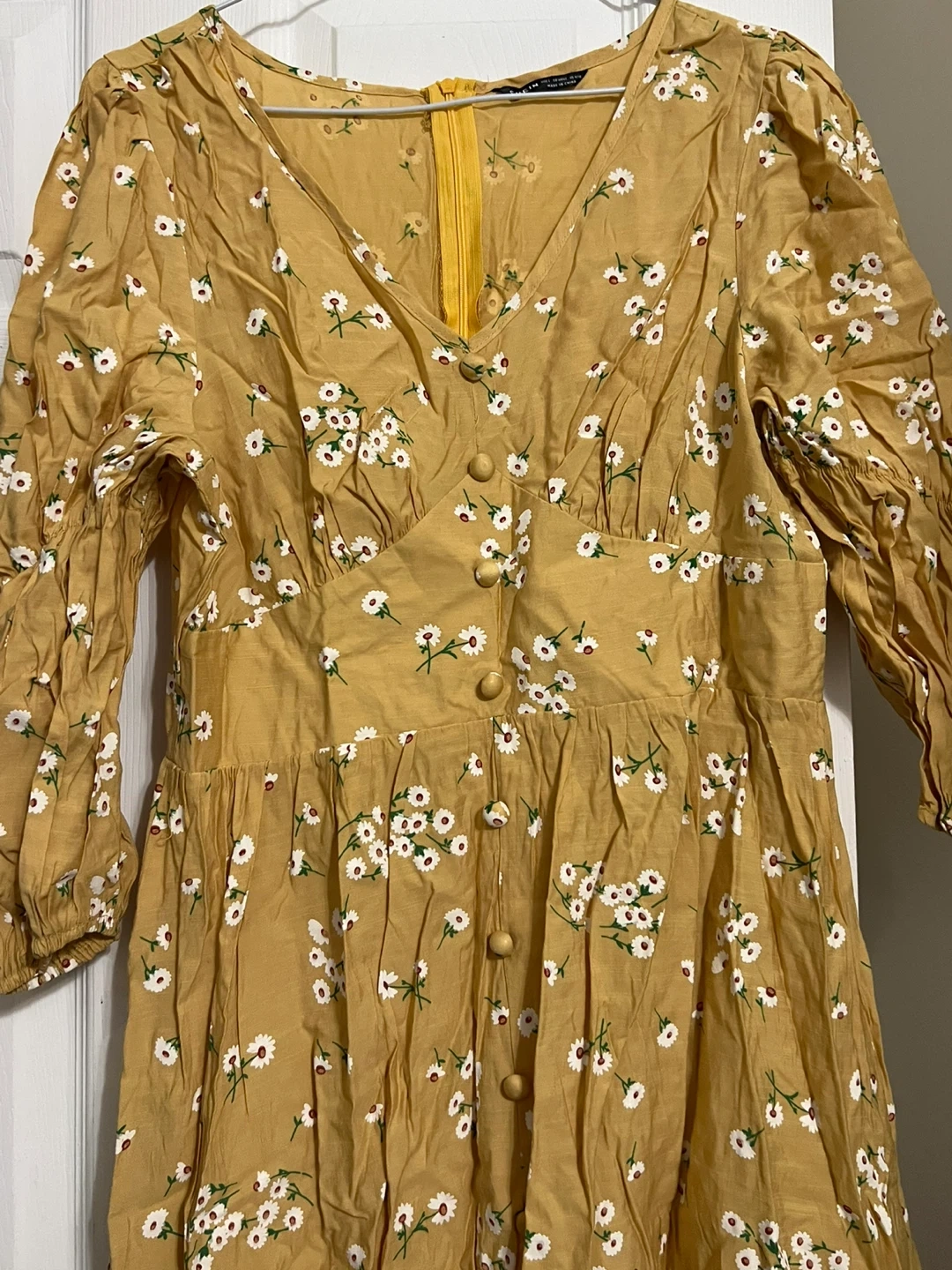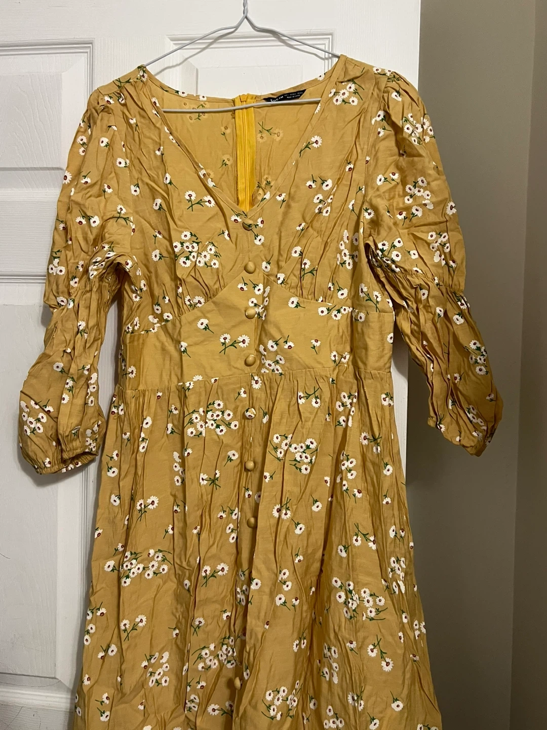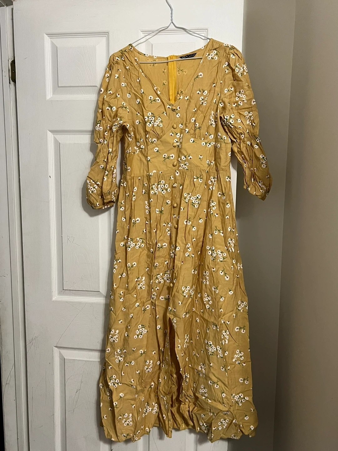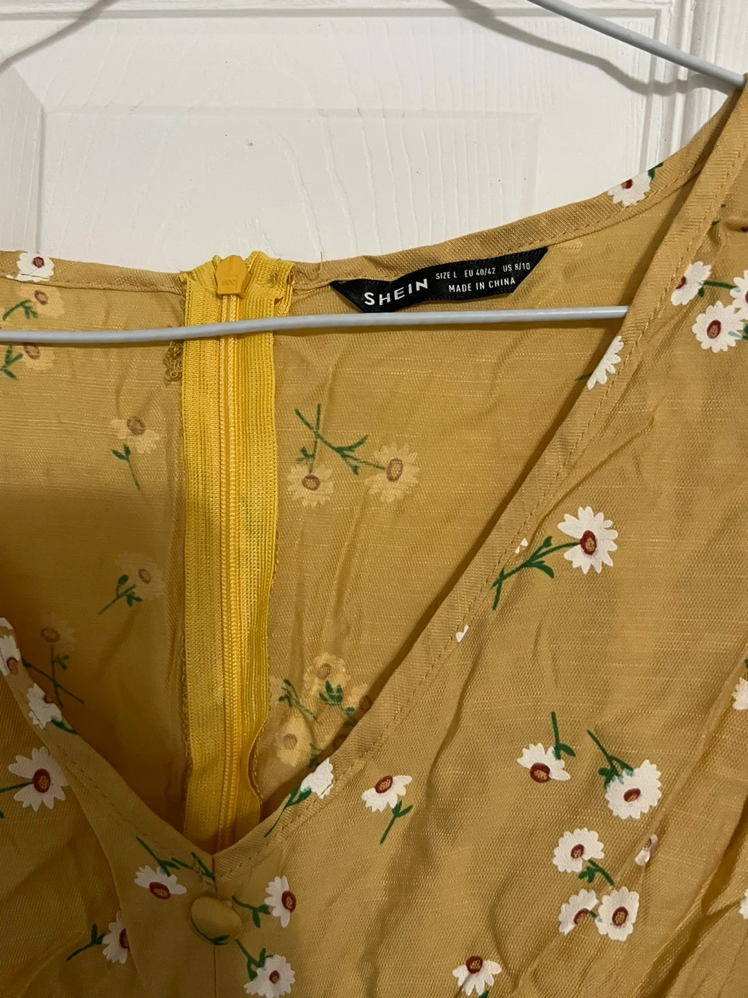 Selling a cute Shein dress in size L! It features a lovely floral pattern on a yellow background. Perfect for a sunny day out or a casual gathering!