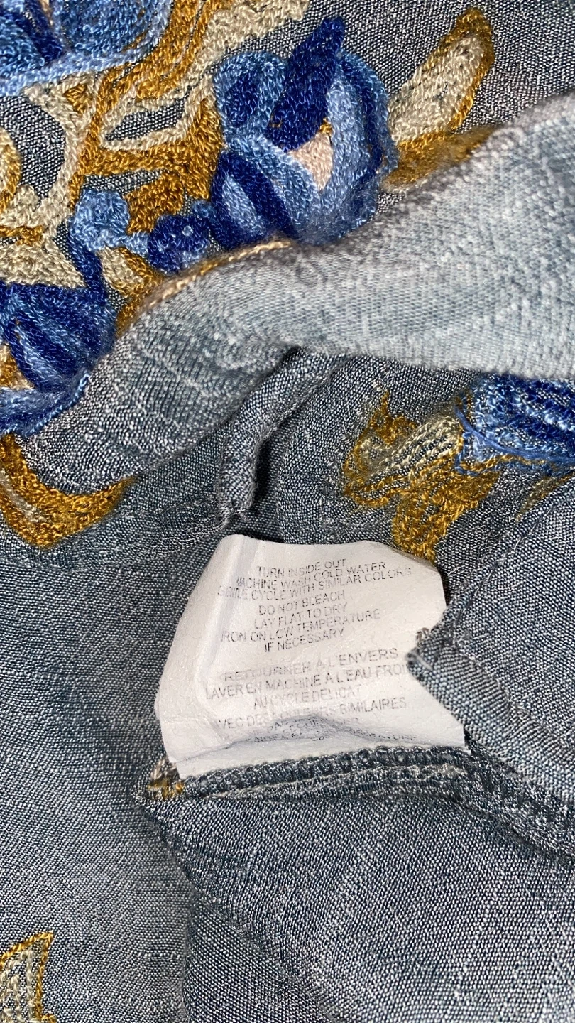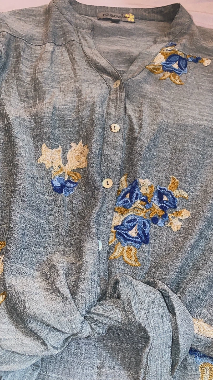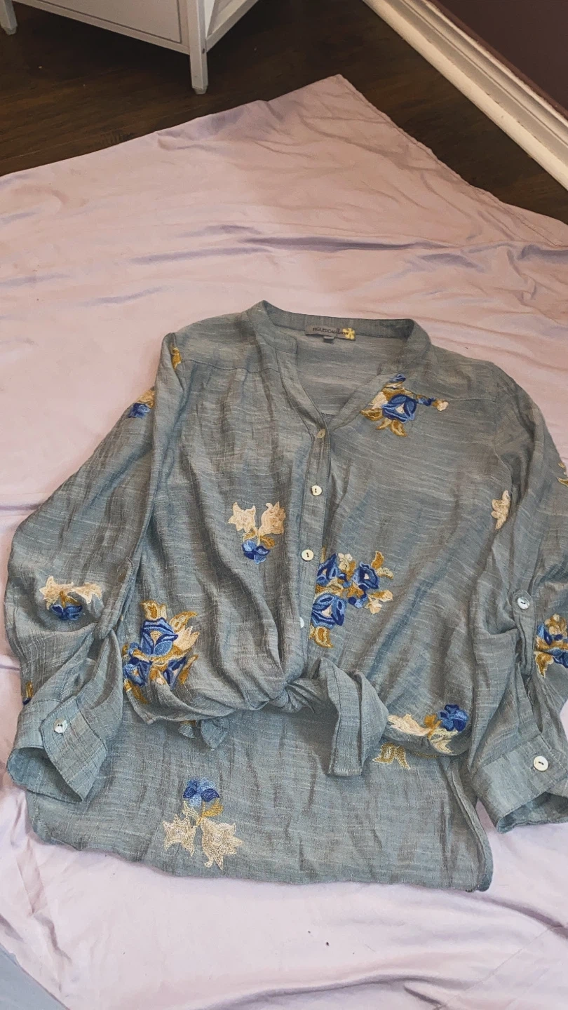 This like new blouse features lovely floral embroidery details, it is a button up and has a bottom tie front. Perfect for adding a touch of elegance to your wardrobe!