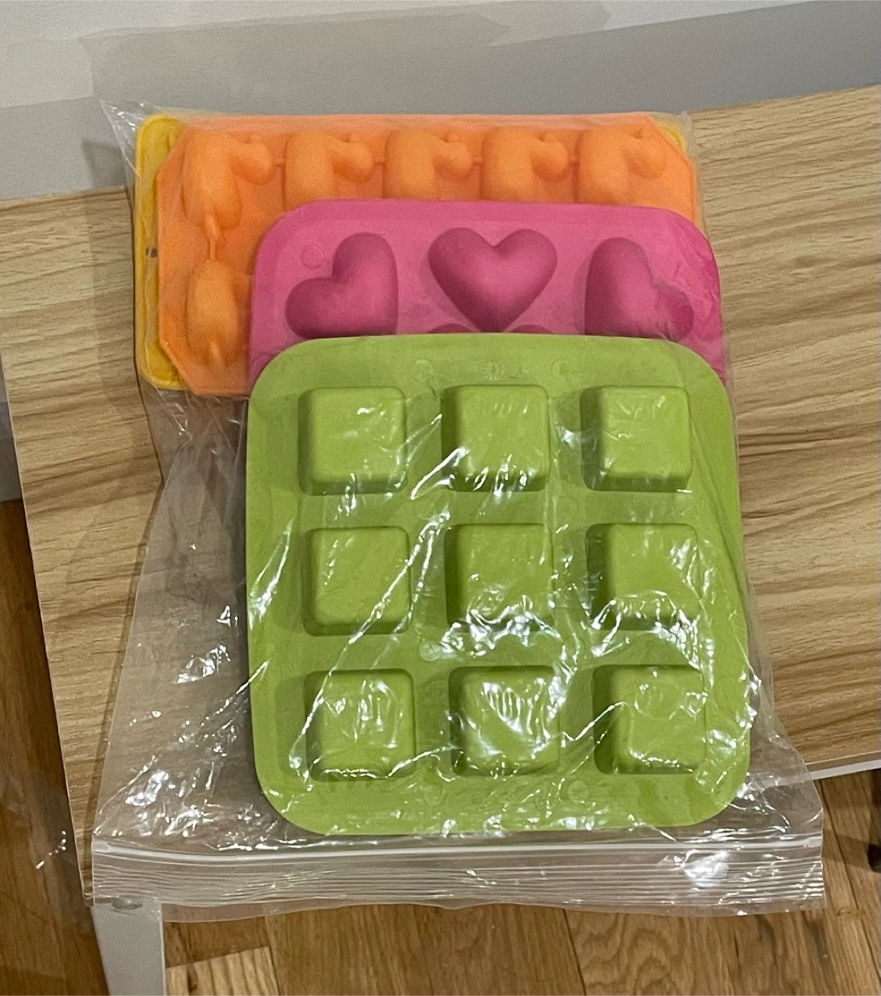I have a set of silicone molds for sale. They come in various shapes including hearts, squares, fish, and letters. Great for baking or crafting!