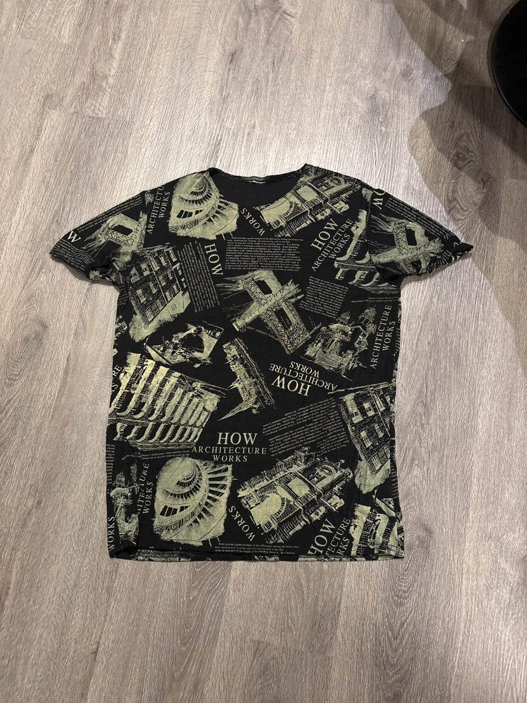 Cool t-shirt with an all-over architecture print! The design features various building illustrations and text excerpts. Great for adding a unique touch to your wardrobe