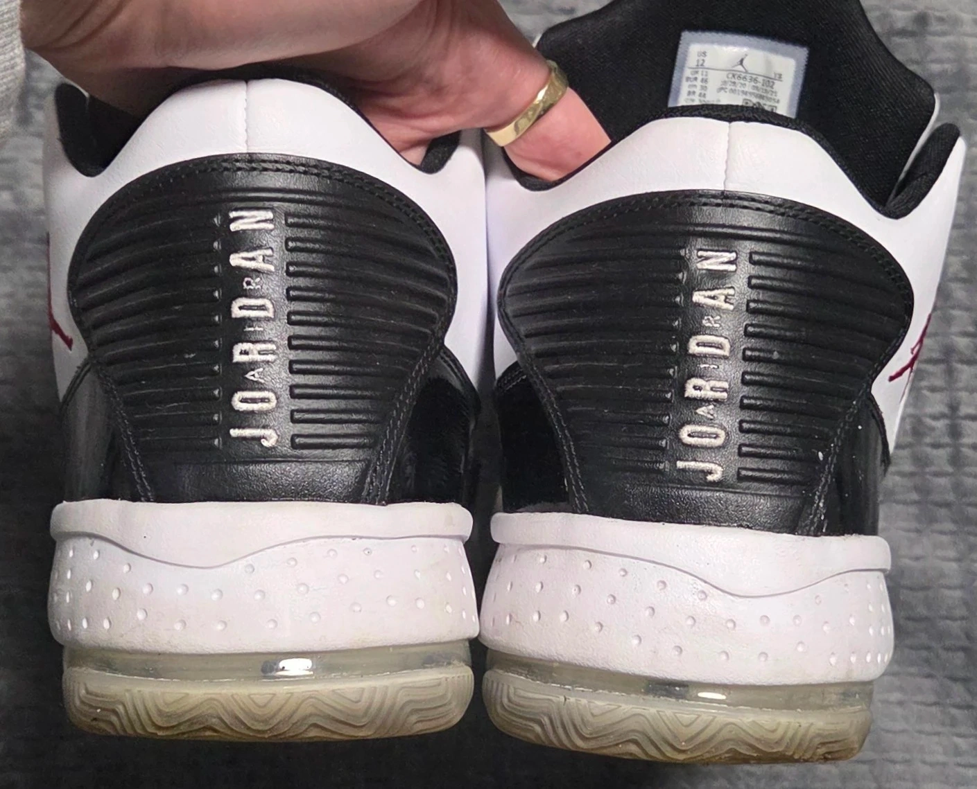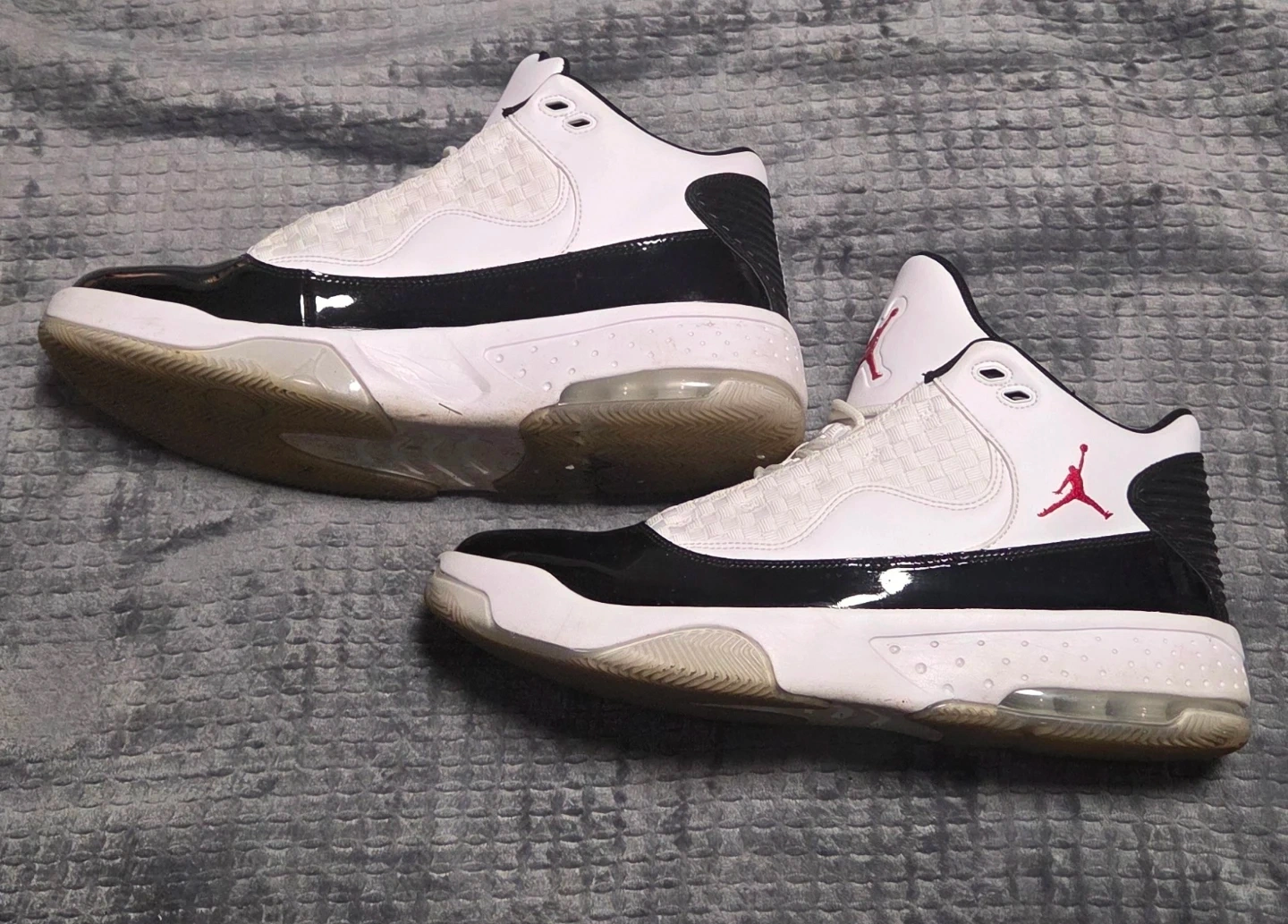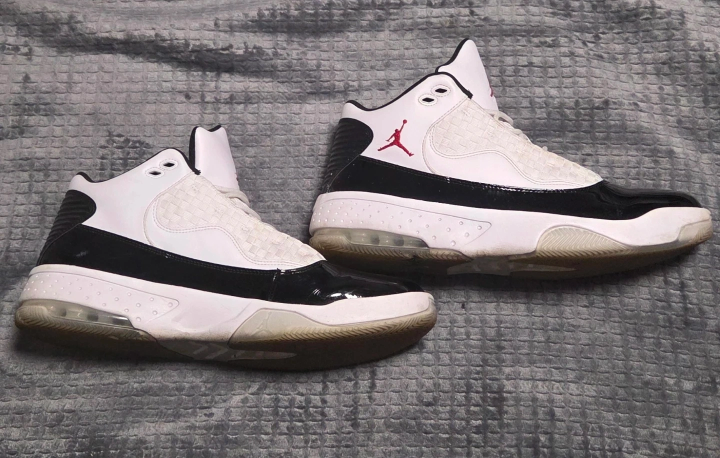 Selling a pair of Jordan Max Aura 2 sneakers in a classic white and black colourway. They are a US size 12. These are in good condition with very little wear.