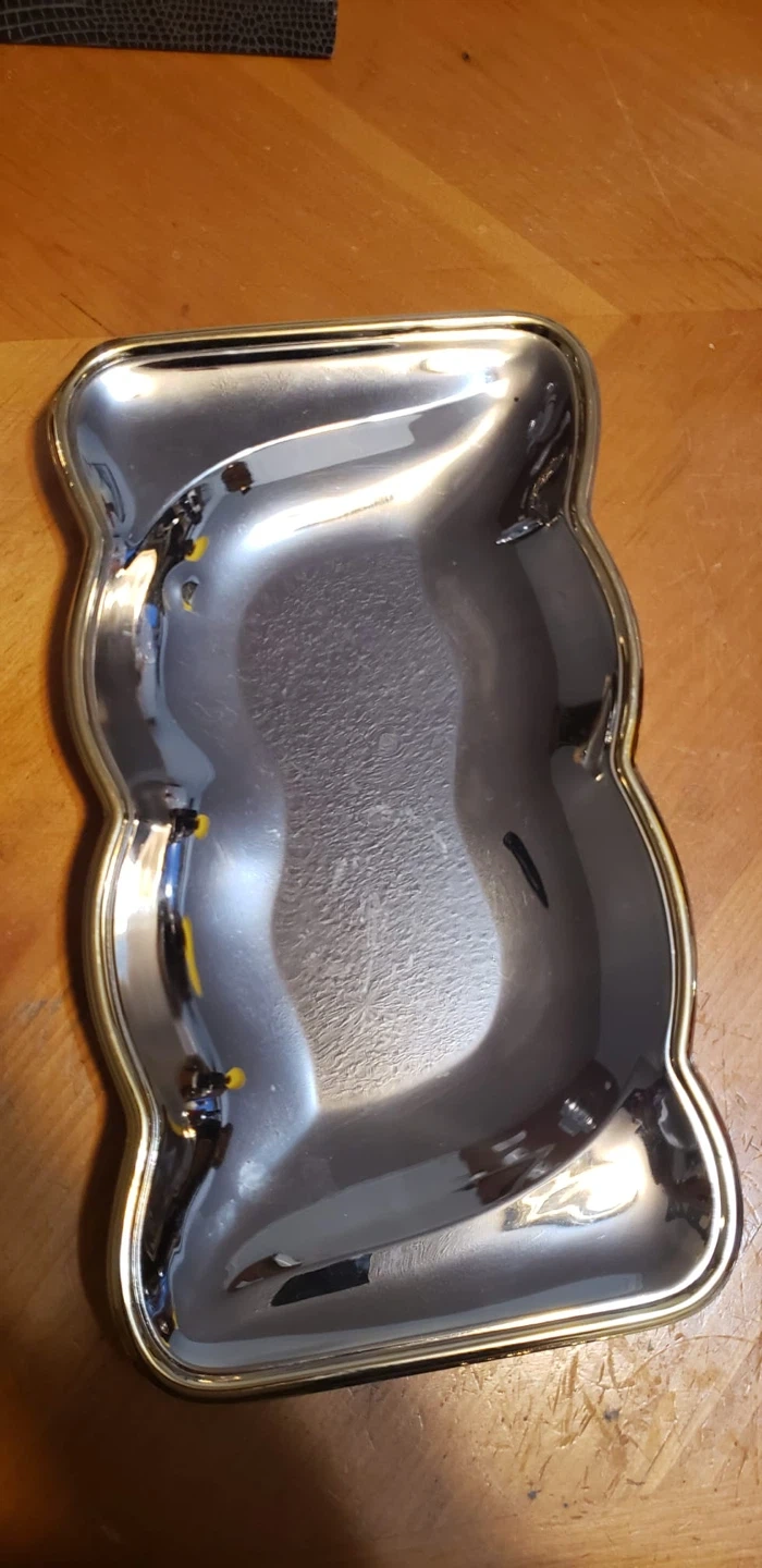 Selling a silver serving tray that has a gold trim. It's in good condition and would be perfect for serving snacks or drinks