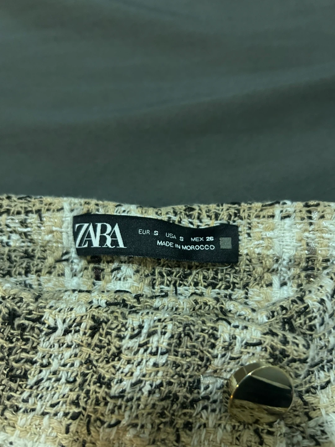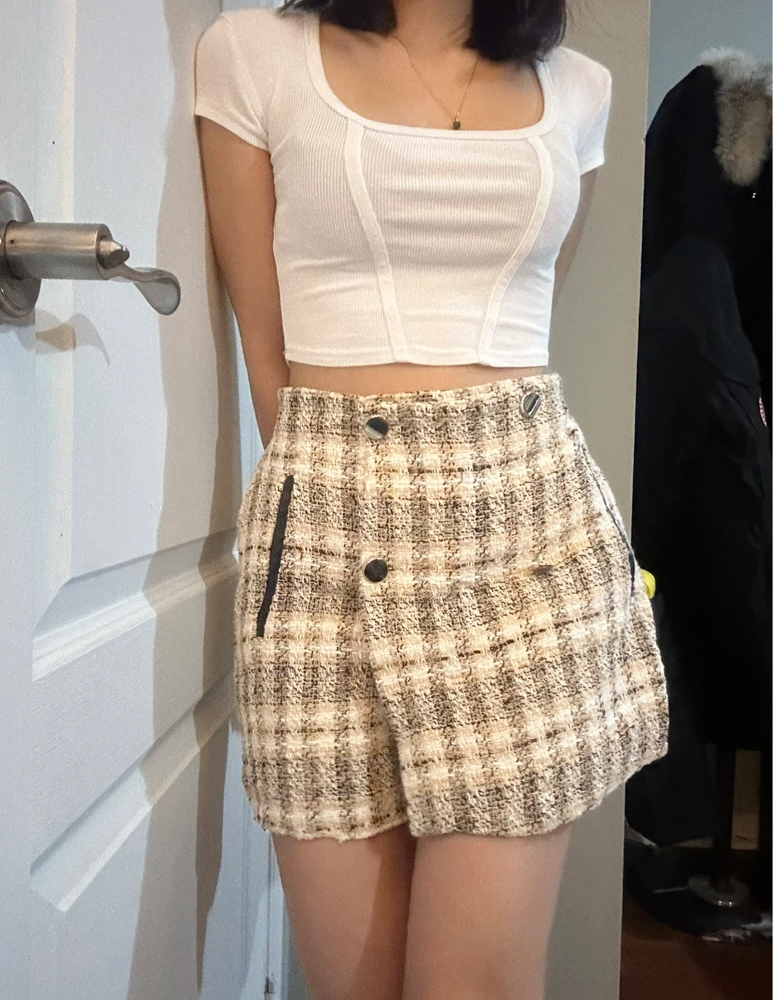 Selling a cute pair of Zara tweed shorts! They're a size small and feature a stylish plaid pattern with decorative buttons. Perfect for adding a touch of chic to your wardrobe! One button is loose.