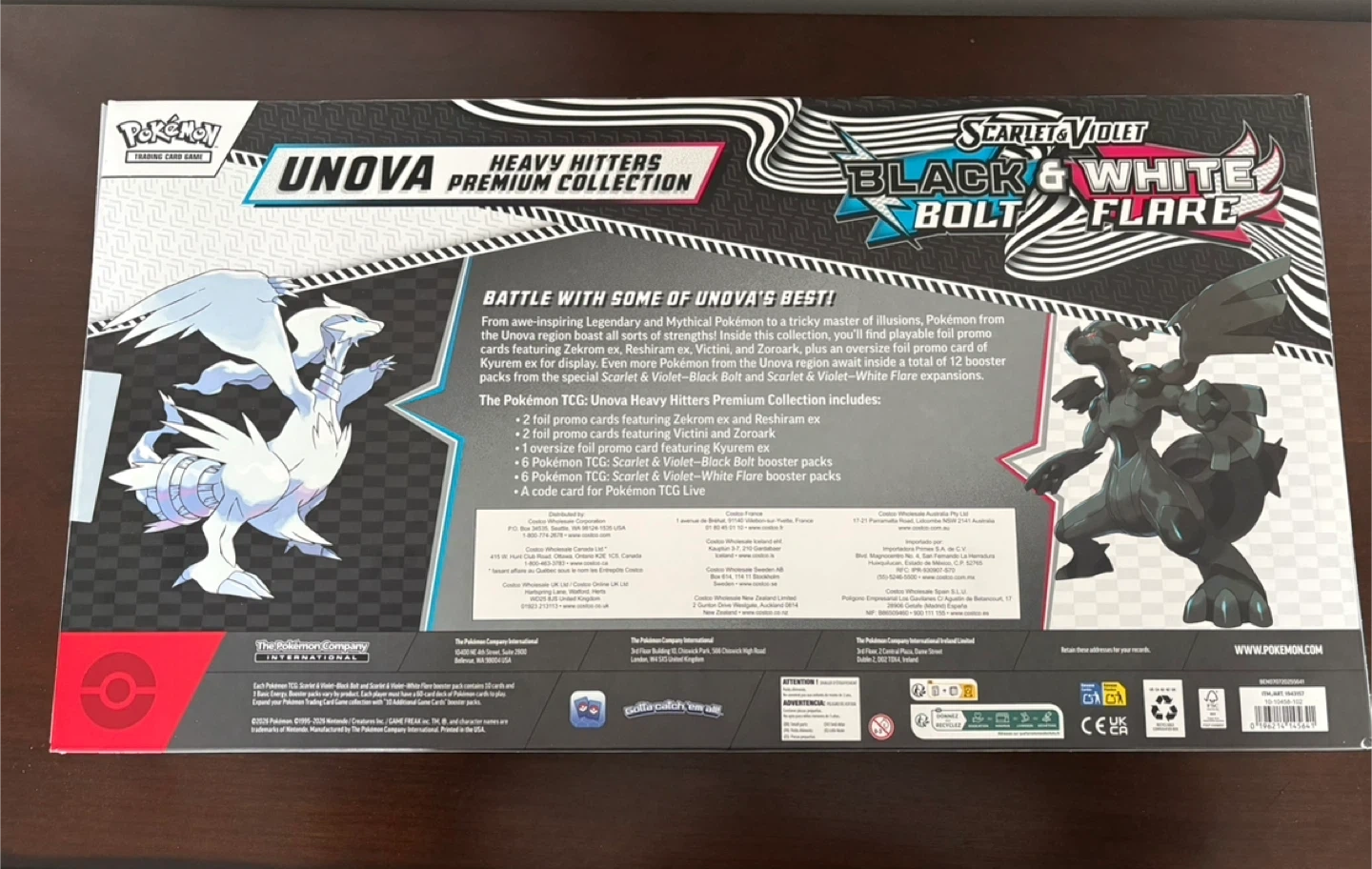 Selling a brand new Pokémon TCG Unova Heavy Hitters Premium Collection! This set includes foil promo cards featuring Kyurem ex, Zekrom ex, Reshiram ex, and Zoroark, plus an oversize foil promo card of Kyurem ex for display. You'll also find 6 Pokémon TCG Scarlet & Violet-Black Bolt booster packs and 6 Pokémon TCG Scarlet & Violet-White Flare booster packs, and a code card for Pokémon TCG Live. Perfect for any Pokémon collector or player!