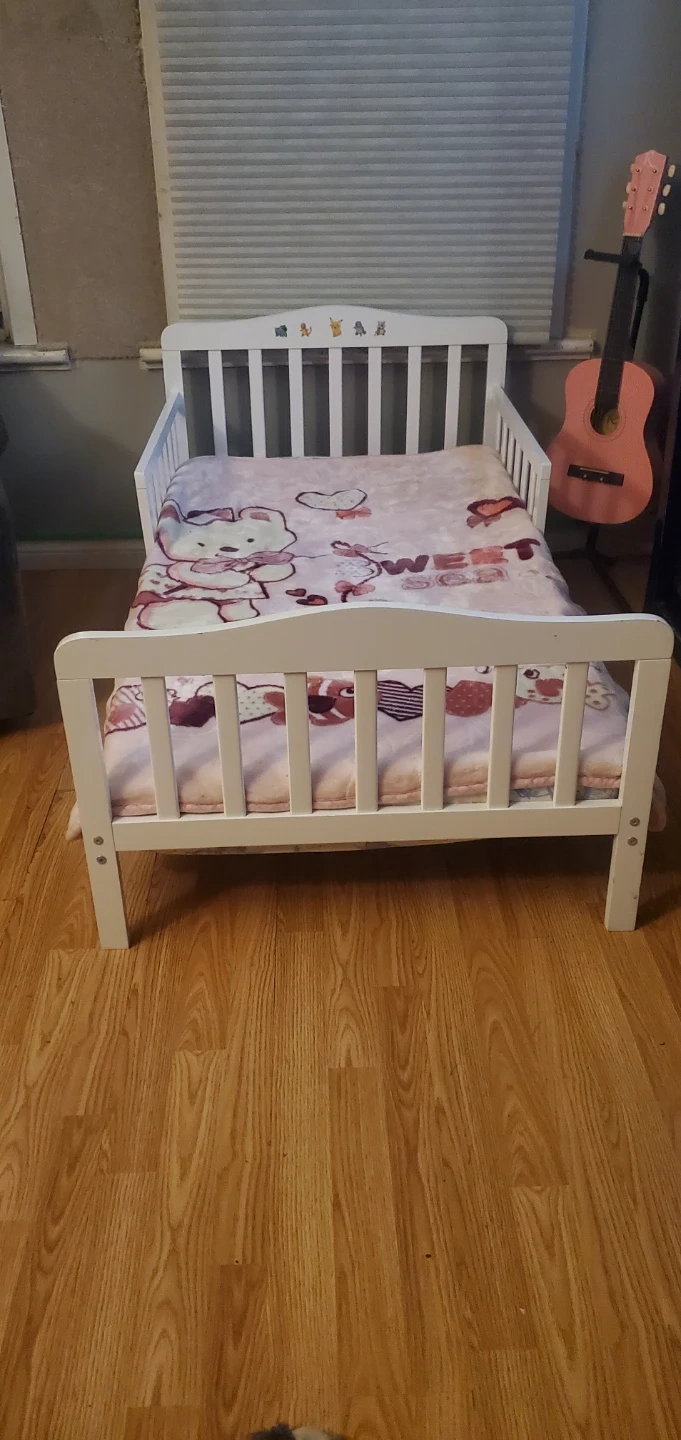 Selling a toddler bed. It's in great condition and ready for a new home! Perfect for transitioning your little one from a crib to a bed. It's low to the floor. Comes with safety rails, mattress Included. JPMA certified.