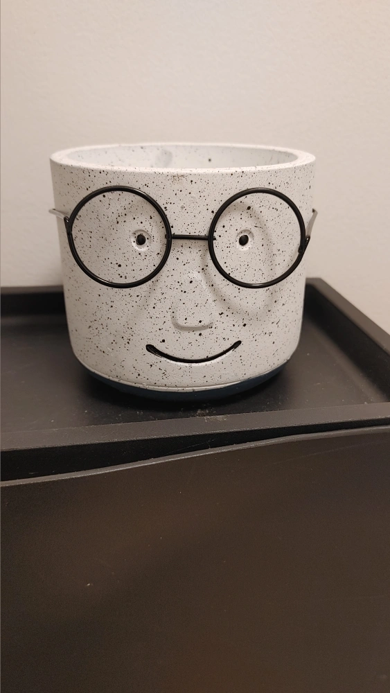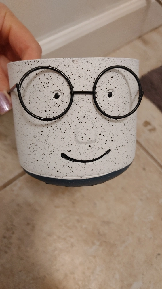 Cute speckled planter with a face and glasses detail. It's new and ready for a new home for your plants!