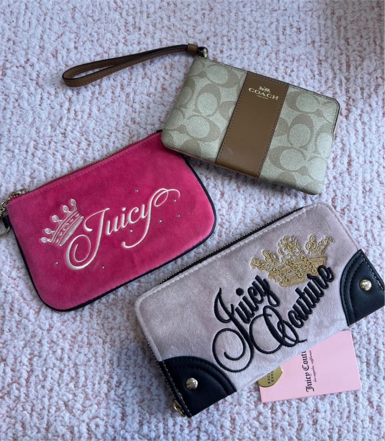 Selling a few cute wristlets! There's a pink Juicy Couture one, a light pink Juicy Couture wristlet with black accents, and a Coach wristlet. They're all in great condition and perfect for carrying your essentials!