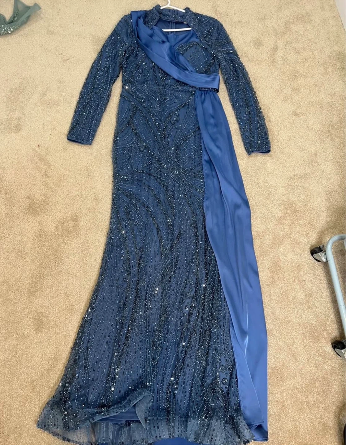 Beautiful dazzled blue dress long sleeves, modest and back covered.