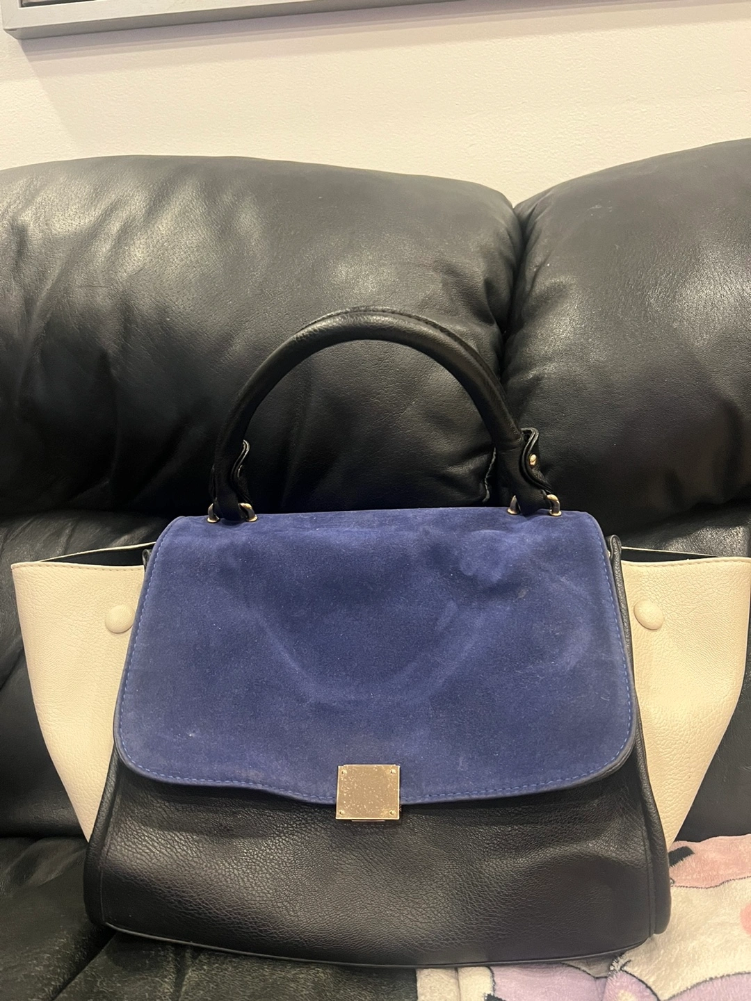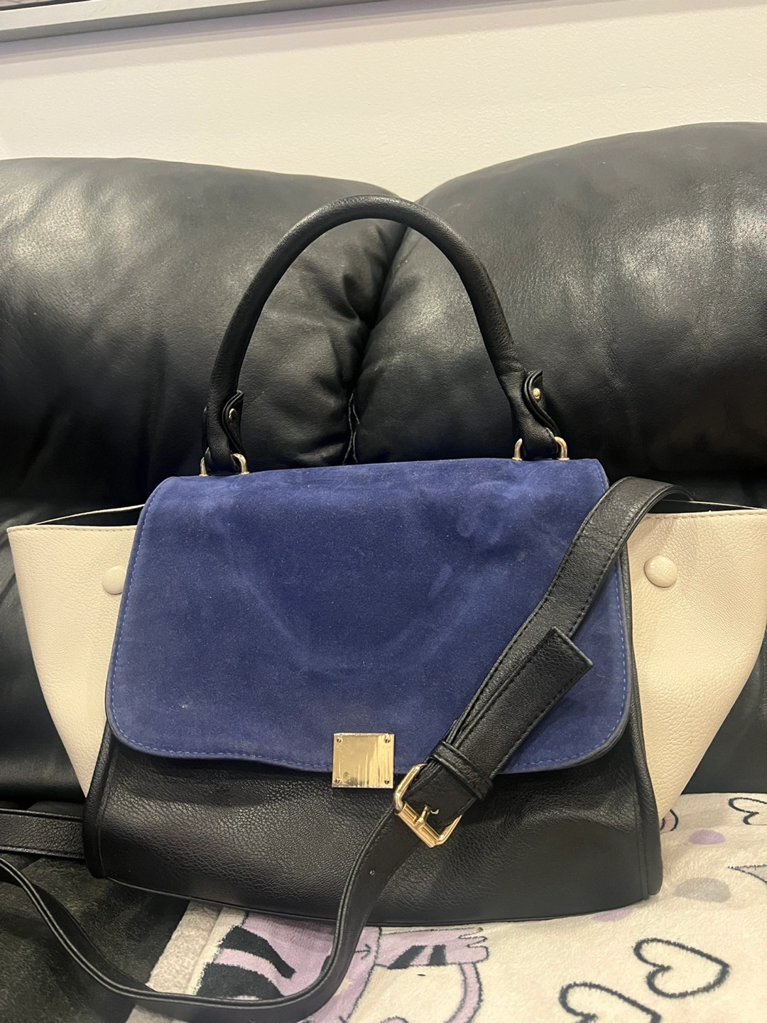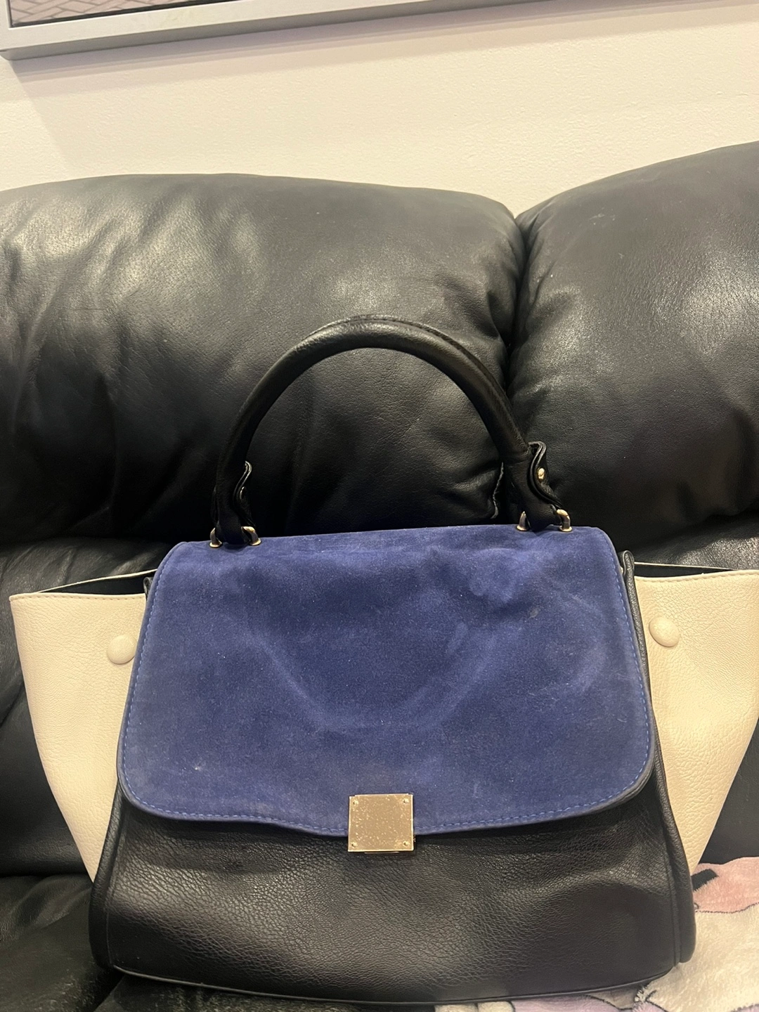 Selling a Celine Trapeze handbag in a stylish colour combination of blue, sand beige, and black. It's a beautiful bag that's in great condition and ready for a new home!