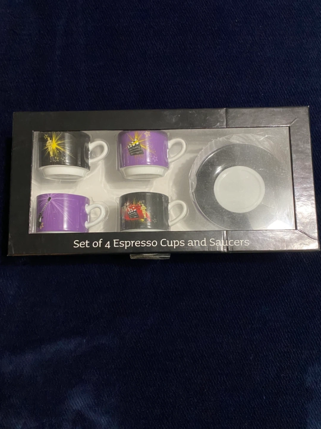 Selling a set of Madame Tussauds espresso cups and saucers! The set includes four espresso cups with different designs and matching saucers. Never used. Comes in the original box! Open to offers