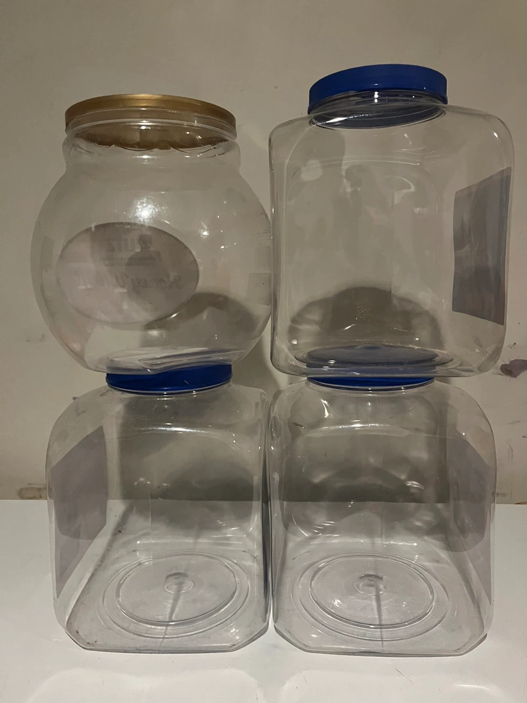 4 empty clear canisters/tubs/containers. All in excellent shape and great condition. Originally contained crackers and pretzels. From smoke pet free and healthy home.