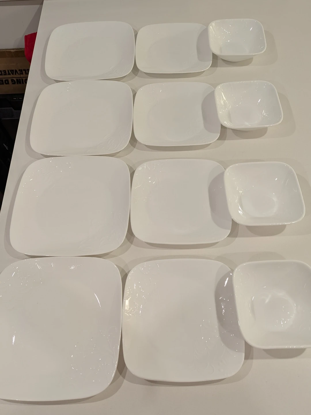 Selling a Corelle square white dinnerware set. Includes 4 dinner plates, 4 salad plates and 4 bowls. These are lightweight and durable, perfect for everyday use! They have a simple, elegant design that fits any table setting.