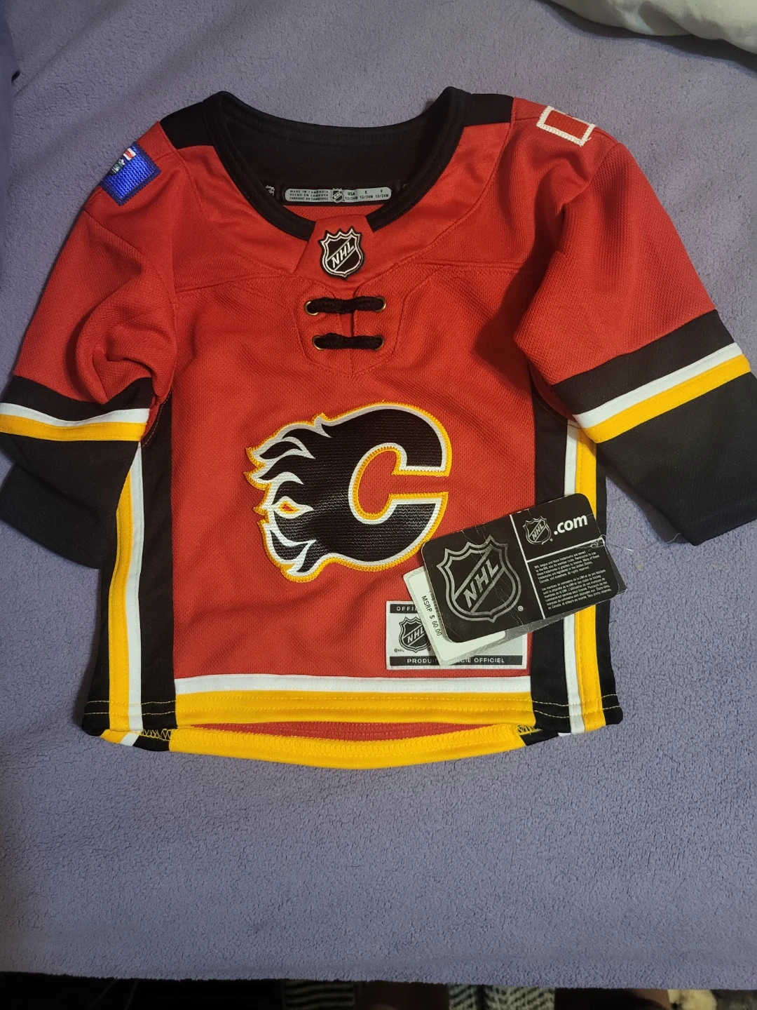 Selling a toddler-sized Calgary Flames NHL jersey! It's in great condition and perfect for your little hockey fan. The size is 12/24M.