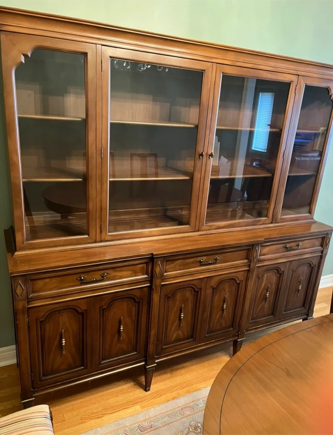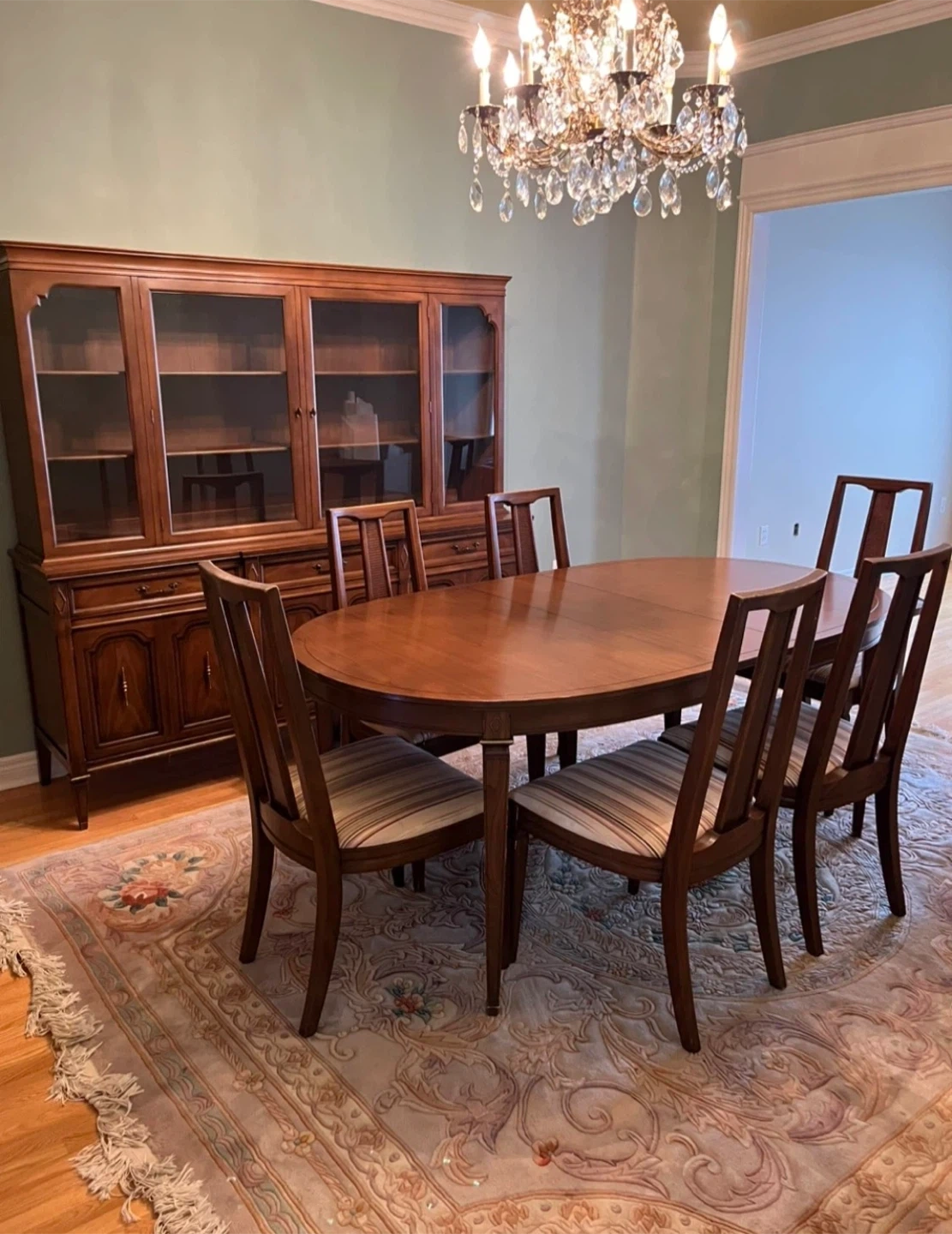 Selling a beautiful dining room set! It includes a large dining table, six chairs with striped cushions, and a hutch for storage and display. The set is in great condition and would be a lovely addition to any home