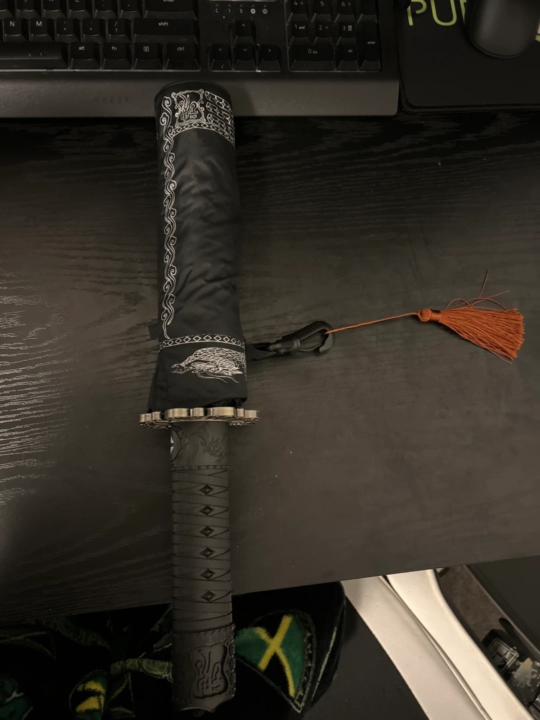 Selling a katana umbrella, perfect for rainy days! It has a unique design with a katana-style handle and a tassel. It's black with decorative patterns.