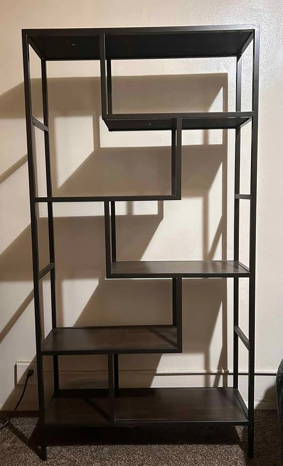 Black metal frame with staggered wood-look shelves. Stylish design perfect for books, plants, or decor. Dimensions: 36"W x 12"D x 70"H. Bought recently, selling due to move. Pickup only. Tall/heavy item — please bring help. Cash or Zelle.