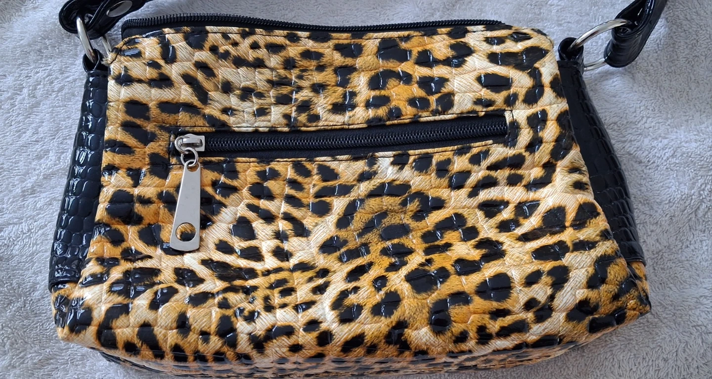 Selling this stylish shoulder bag! It features a fun leopard print on the front and a sleek black finish on the sides and strap. It's in great condition and ready for a new home