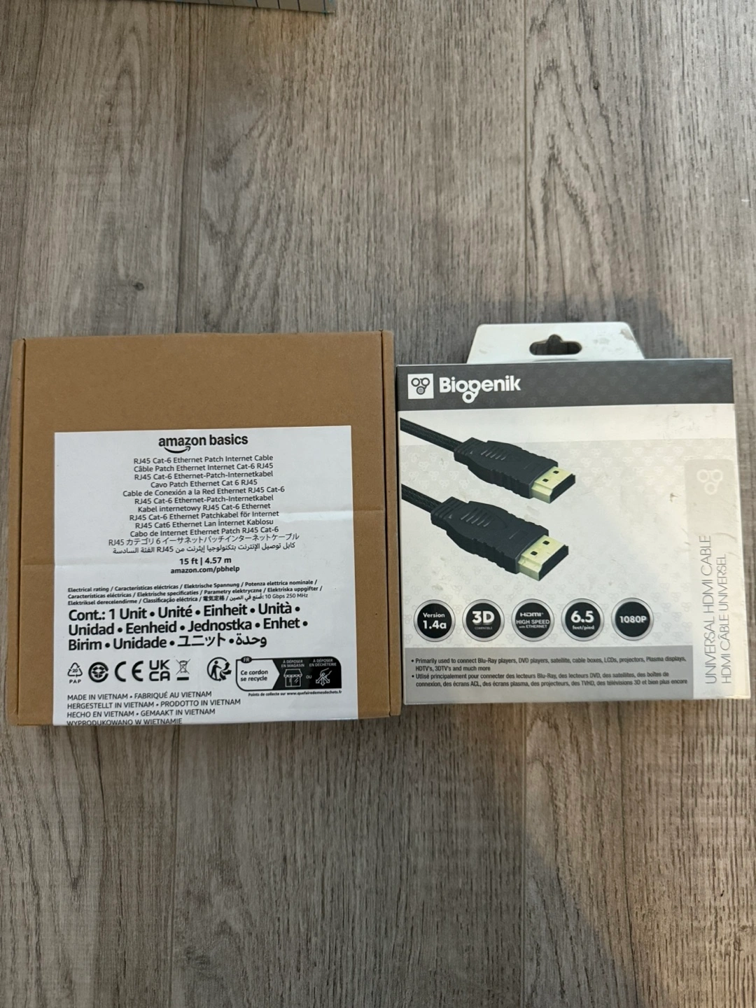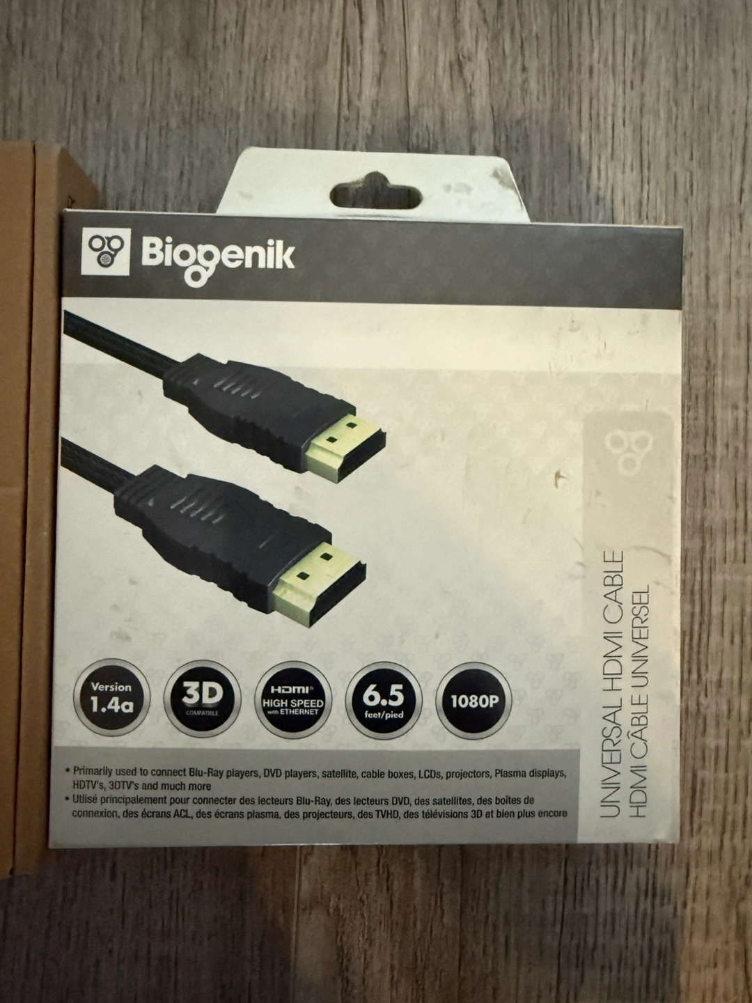 Selling a brand new Biogenik Universal HDMI Cable! It's version 1.4a, supports 3D, and has high-speed ethernet. It's 6.5 feet long and supports 1080p. Also included is an Amazon Basics RJ45 Cat-6 Ethernet Patch Internet Cable, 15 ft long.