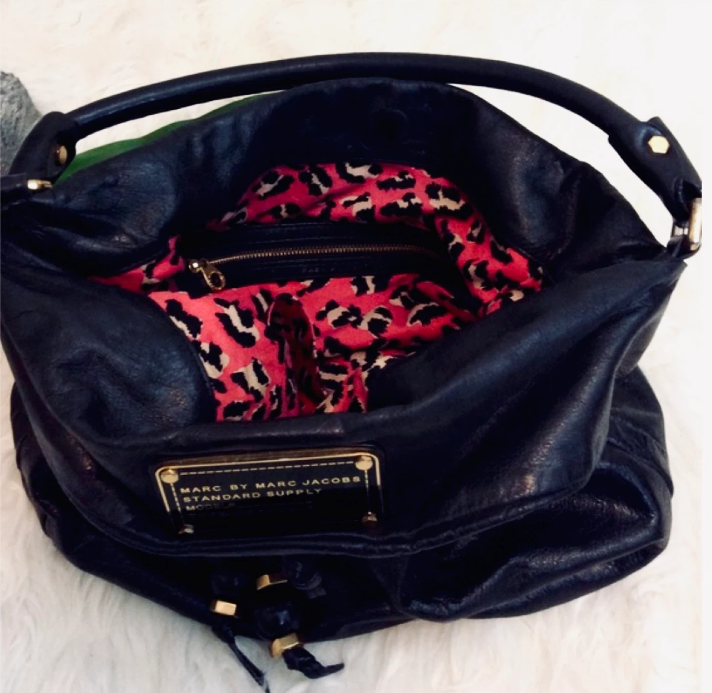 A favorite, Marc by Marc Jacobs black leather Q Hiller hobo bag with magnetic closure at top, gold accents and a red leopard print inside.