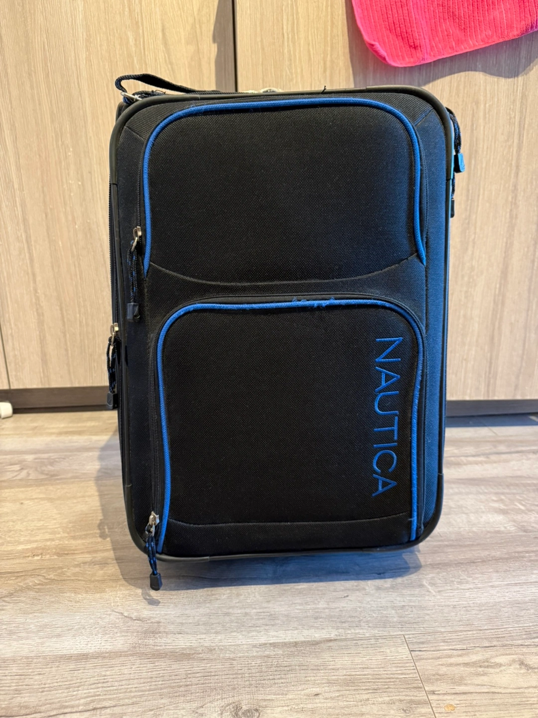 Selling a Nautica in black with blue trim. It's in great condition and ready for your next trip! The suitcase features multiple compartments and a telescoping handle for easy maneuvering. Pick up by the Eaton Center $15