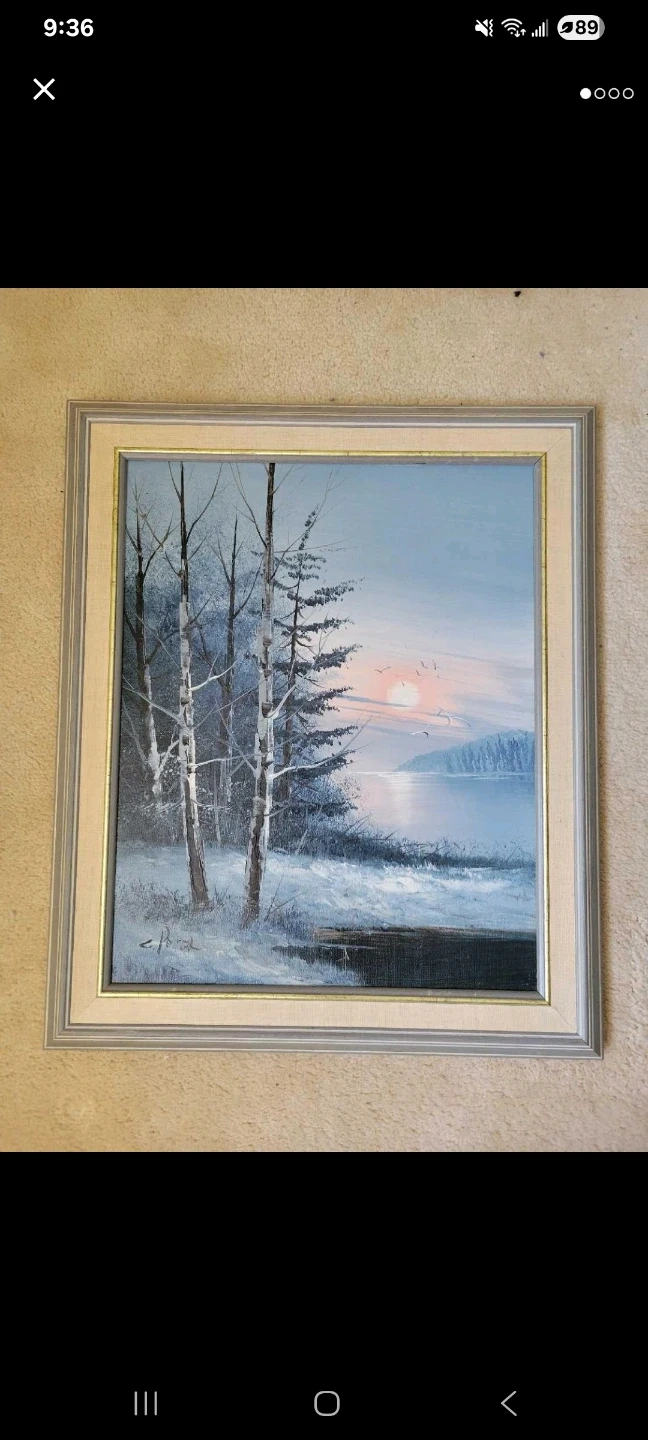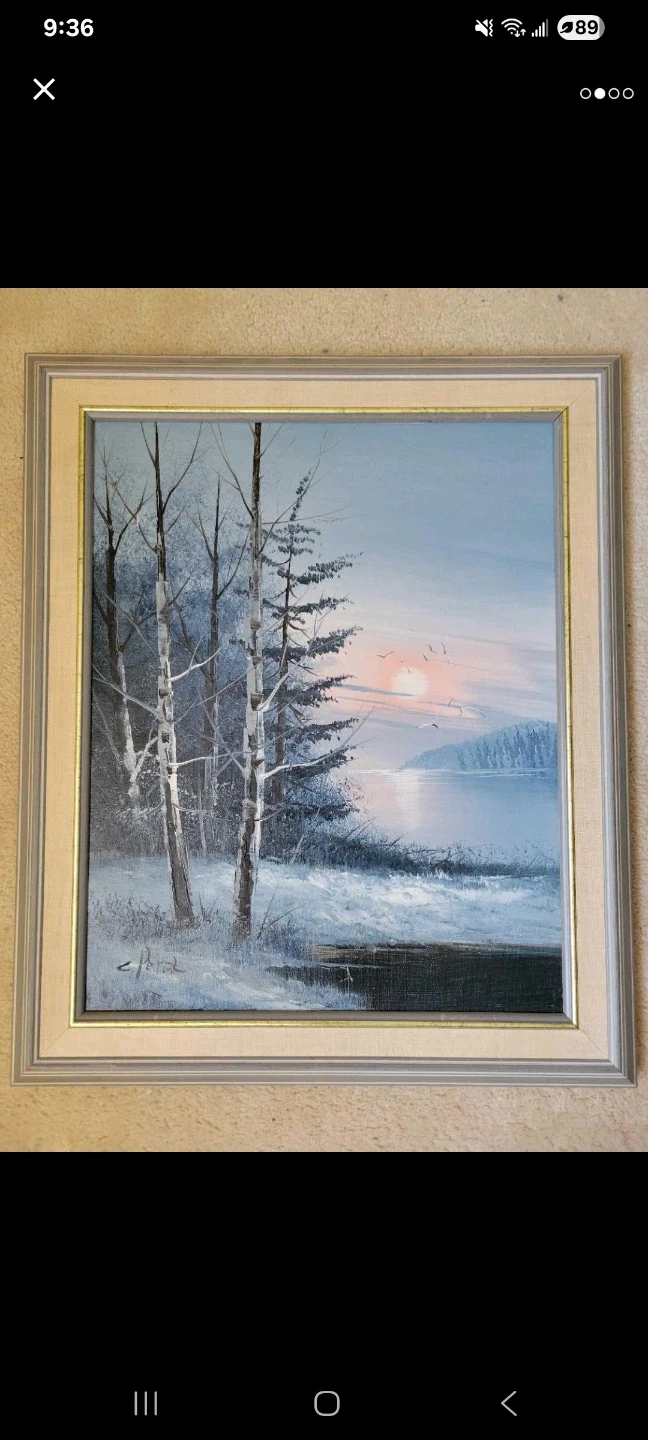Beautiful winter landscape painting, framed and ready to hang! The artwork is signed.