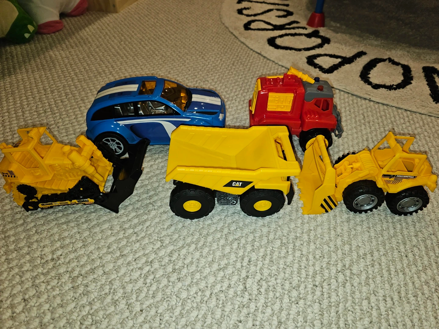 A fun set of construction vehicle toys! Includes a CAT dump truck, a blue car, a red truck, and two construction vehicles. Great for kids who love playing with cars and trucks