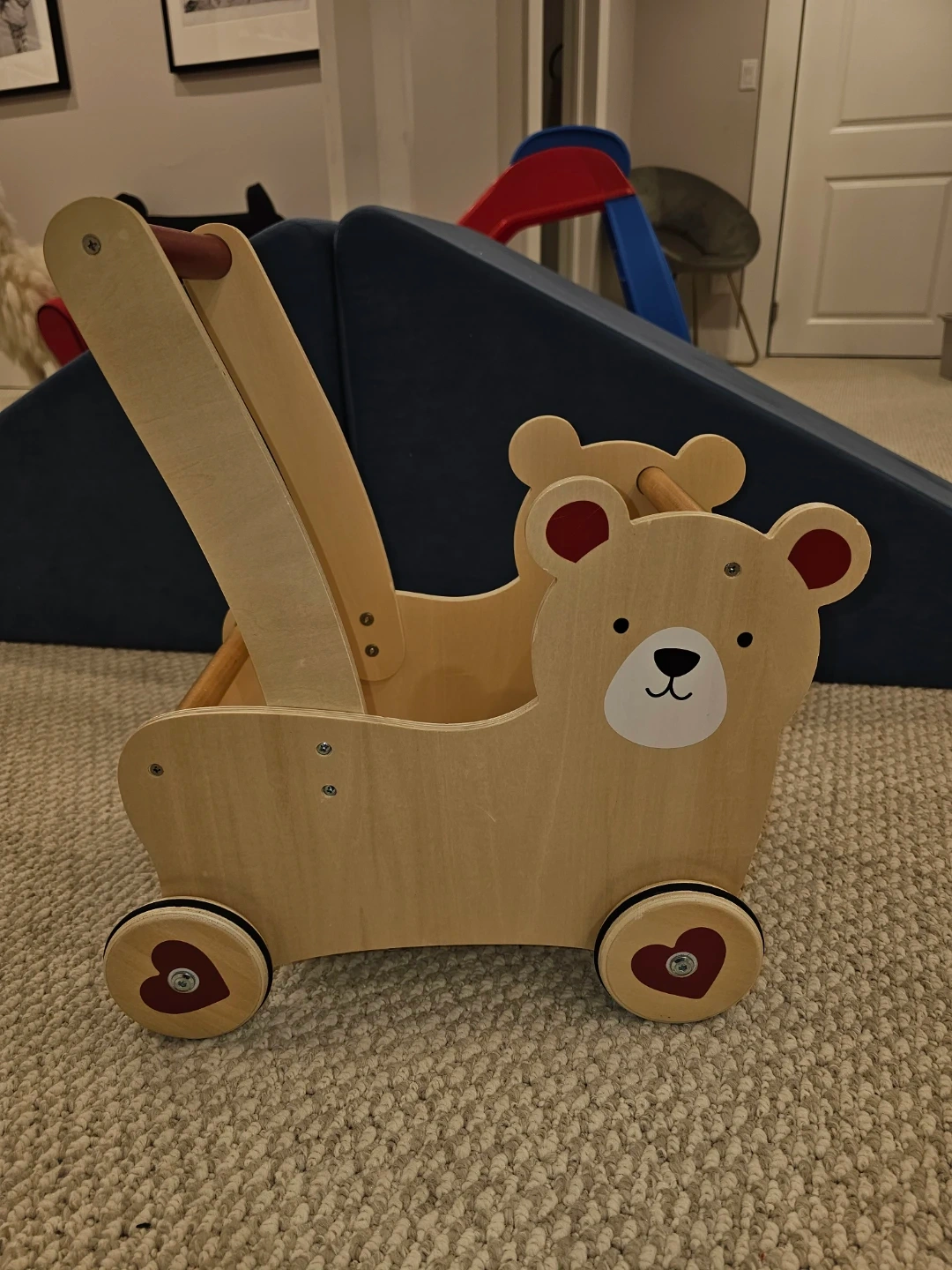 This adorable wooden bear baby walker is perfect for little ones learning to walk! It's in great condition and ready for a new home. The wheels have cute heart details, adding a touch of charm