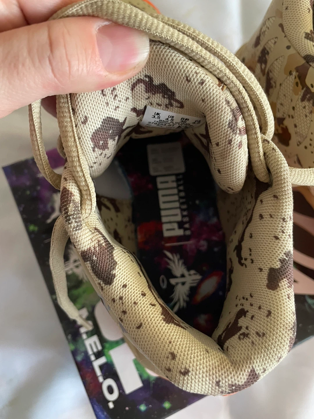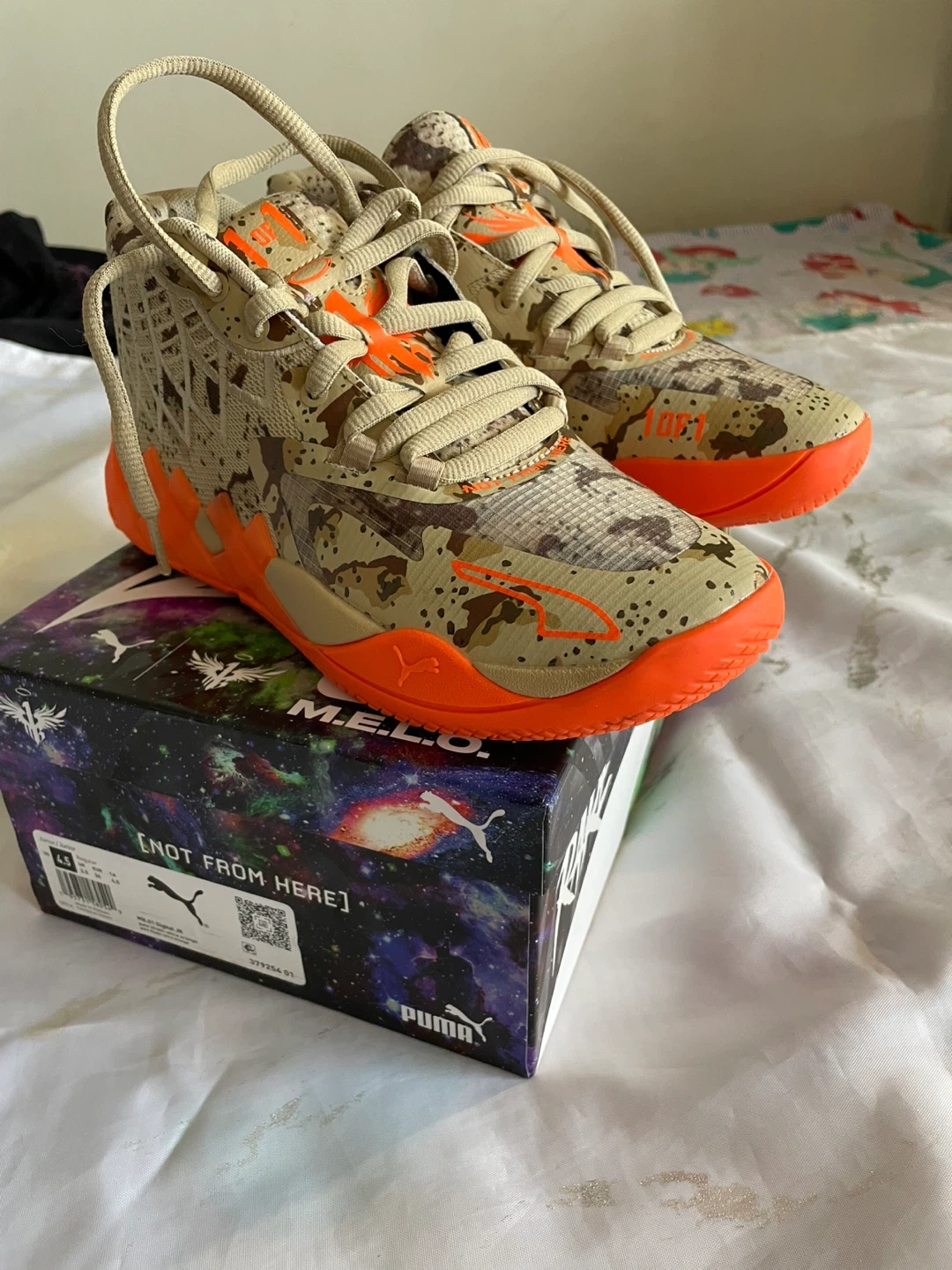 Selling a pair of Puma Melo Rare Reserve basketball shoes in a US size 4.5 Junior. These shoes feature a unique camo pattern with vibrant orange accents. They come with the original box, making them perfect for any basketball enthusiast or sneaker collector! Sorry there is no receipt.