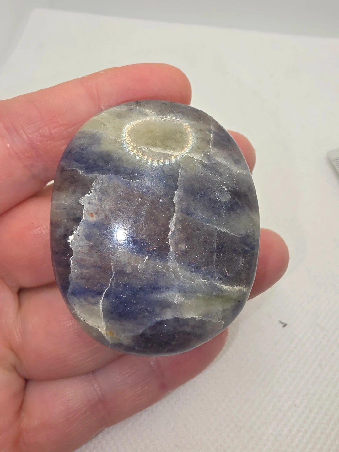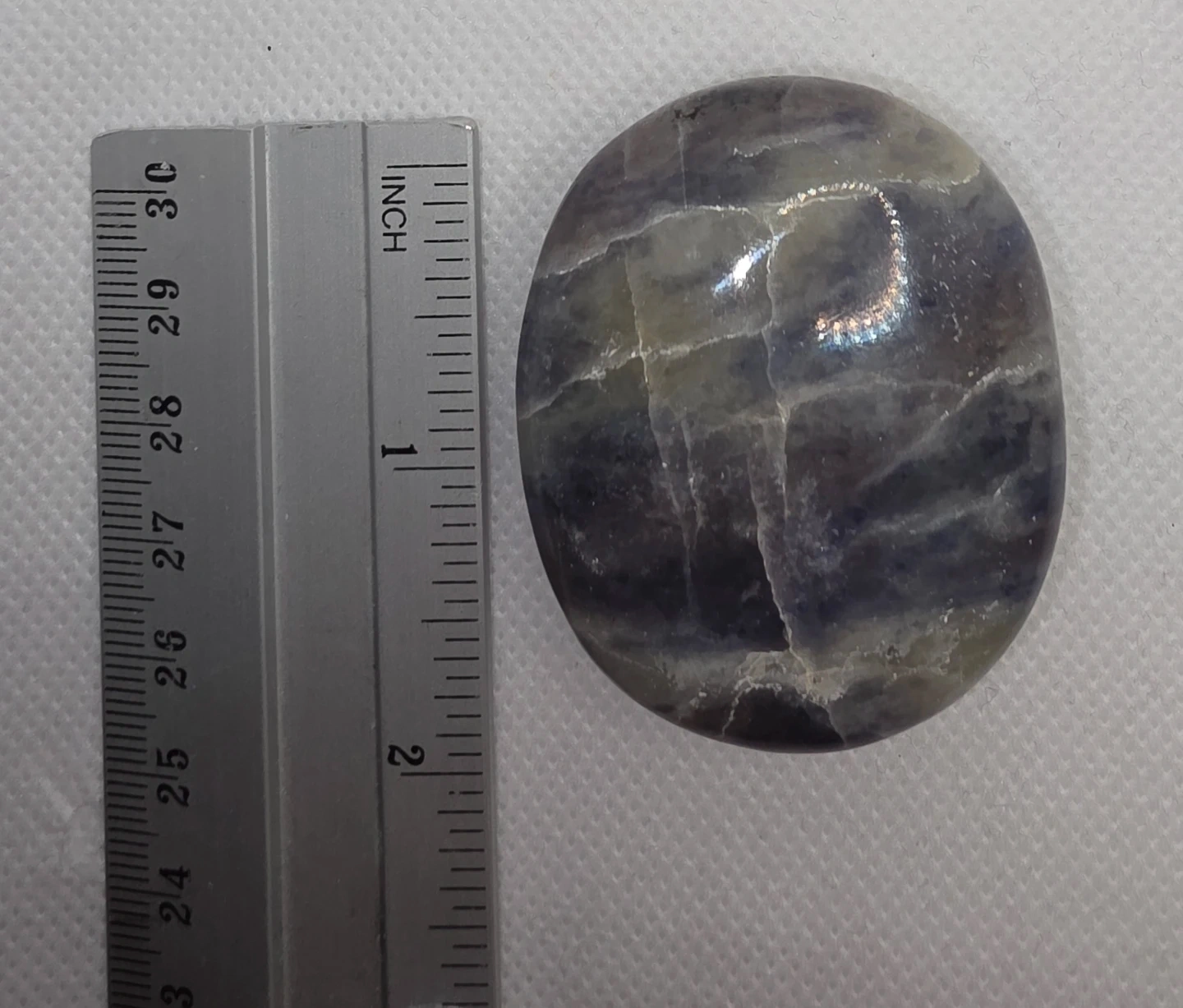 Iolite palmstone. It's a beautiful mix of blues, greys, and whites. It measures approximately 1.5 inches in length. Pickup 5 min from high park station.